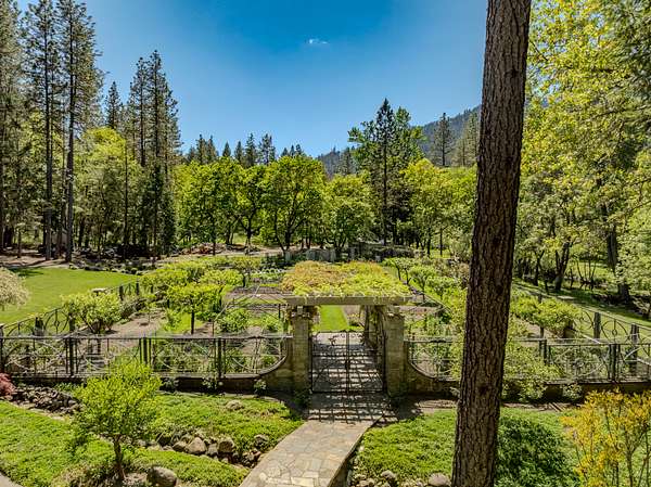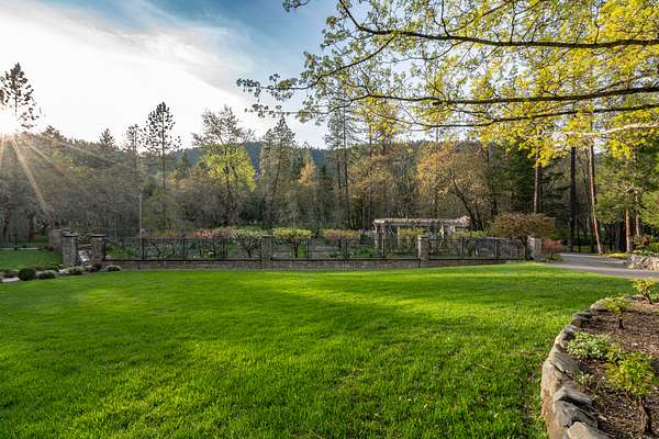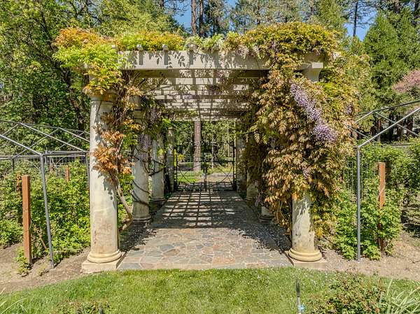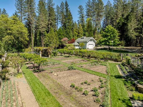 Garden ~ A fully developed, deer-fenced garden spans approximately 15,000 square feet, enclosed by custom stone and ornamental iron fencing and gates. Inside the garden, a large trellis, and well-maintained lawn walkways define the space. The planting areas include fruit trees, berries and ample bed space for seasonal veggies and other plantings: Fruit trees include Apple, Pear, Nectarine, Peach, Pluot, and Plum. Berries include Raspberries, Blackberries, and Strawberries. Additionally there are Muscat grapes and asparagus beds. An irrigation system with both drip and sprinkler zones ensures efficient watering.