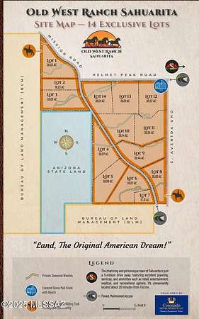 Welcome to Old West Ranch - Sahuarita, where wide-open spaces and modern convenience come together in a true desert retreat. Spread across nearly 458 acres, this exclusive community features 14 estate parcels ranging from 12 to 39 acres-each one offering privacy, flexibility, and room to design the lifestyle you've always envisioned. Just five miles west of Sahuarita, Old West Ranch provides the perfect blend of seclusion and accessibility. Within minutes you can be at schools, shopping, dining, and medical services, yet on your parcel you'll enjoy rolling desert terrain, panoramic mountain views, and endless starry skies. Each property is surveyed, pinned, and ready to build. With underground utilities already in place and wells/septic systems to be installed by the owner, you have the freedom to create a custom home or ranch estate that fits your vision. No HOA, only a low shared cost for maintaining trails, monuments, fencing, and signage (~$132/year per lot), ensures independence without losing community amenities. Picture evenings on your porch with breathtaking sunsets, mornings exploring 8+ miles of private community trails, and weekends riding or hiking directly into adjacent State and BLM lands. Wildlife is abundant, yet the peace and quiet of the desert make it feel like your own private sanctuary. This is more than landit's a chance to create a lasting legacy estate in Southern Arizona. Ask us about our trusted relationships with builders, lenders, and architects to help bring your dream ranch to life at Old West Ranch