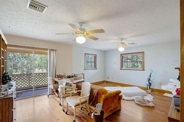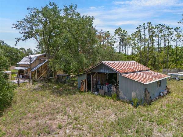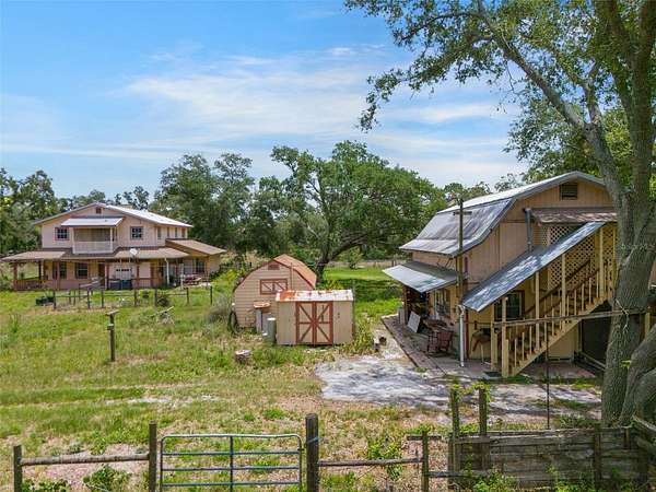 Under contract-accepting backup offers. Welcome to a one-of-a-kind 5-acre estate in the heart of Myakka City, offering the perfect blend of country charm, income potential, and multigenerational living. This unique property features multiple structures and incredible versatility. The main residence is a character-filled 2-bedroom, 3-bathroom home with a custom design and timeless appeal. Step inside through an extraordinary 200-year-old wooden front door and into a spacious living area featuring soaring ceilings, a stunning custom fireplace, and rich wood floors. The open dining area flows seamlessly into the kitchen, with additional storage tucked under the stairwell. A large sunroom with its own entrance has long been a thriving sanctuary for indoor plants and adds to the home's charm. Upstairs, you'll find a generously sized primary suite with a private balcony, an expansive walk-in closet, and master bath featuring his-and-hers vanities and a walk-in shower. A second upstairs bedroom includes its own closet, and the adjacent bathroom offers a tub/shower. There is also an open loft area perfect for a home office or additional living space, as well as a long linen closet for added storage. Downstairs, a back entry leads into a functional laundry/mudroom and a full bathroom. There is also a spacious game room complete with its own sink and countertop area, ideal for entertaining. Additional conveniences include a central vacuum system, custom wood features, and thoughtful storage throughout. Beyond the main home, the detached two-story barn-style building adds even more potential. The ground floor includes a studio apartment with a private entrance, while the second floor offers a 2-bedroom, 1-bathroom apartment, also with a private entrance. There is also workshop or storage space on the ground floor. Nearby, a charming cabin provides yet more potential as it has power, water, and its own bathroom. A large pole barn with water and electric offers flexible use for livestock, equipment, or outdoor gatherings. The property is cross-fenced and includes a front pasture, making it ideal for horses, livestock, or agricultural use. A private well, irrigation system, and chain-link perimeter fencing add convenience and peace of mind. Whether you're looking for a peaceful country retreat, a multigenerational homestead, or an income-producing property, this special Myakka City estate offers room to grow, live, and create.