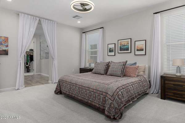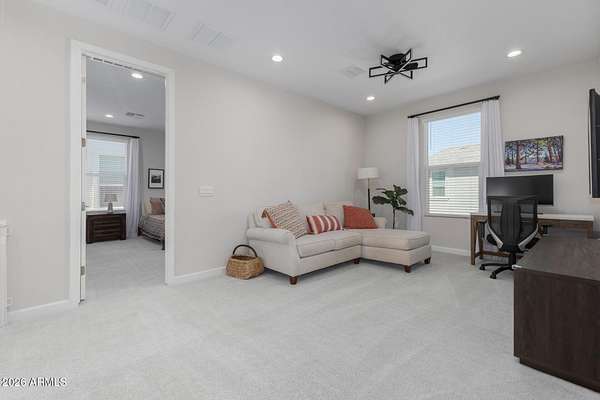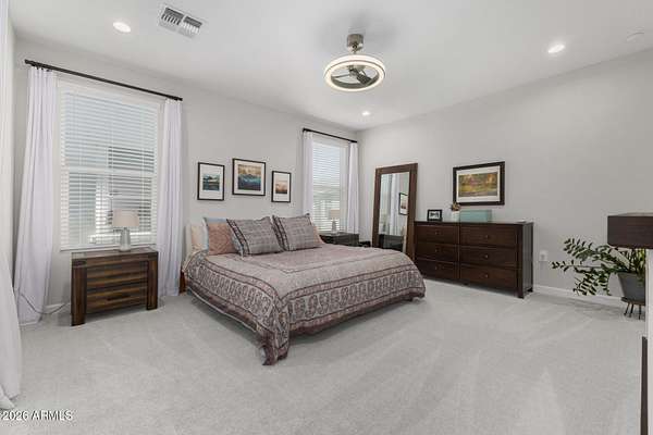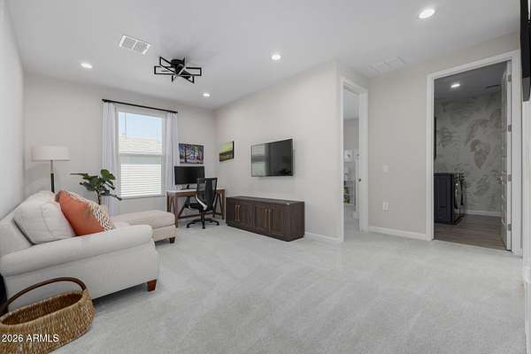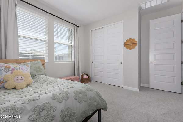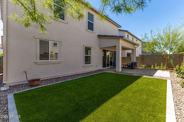 Be the proud owner of this stunning home in the sought-after Arabella! Located ideally in the neighborhood near the community park and pool, yet away from major roads. This Fairmont floor plan is on a premium larger lot and features 4 bedrooms and 3 full baths. Fantastic curb appeal, featuring a manicured, low maintenance landscape and a 2-car garage with a paver driveway. The interior boasts sizable living spaces filled with natural light, 12' sliding glass doors, wood-look tile floors, contemporary lighting, and a stylish neutral palette. The impeccable kitchen is ready for your home cooking, equipped with shaker cabinets adorned with crown molding, induction cooktop, tile backsplash, quartz countertops, and stainless steel appliances. The first floor has a spacious bedroom and full bath. Upstairs, the serene main bedroom has an electric fireplace for comfort and ambiance, a walk-in closet for effortless organization, and a bathroom with double shower head and double sinks for convenience. The loft is perfect for a TV area, kid or hobby space. The upstairs split floor plan also has a full secondary bath, two secondary bedrooms, and laundry room. Gather with your loved ones in the backyard, including a covered patio, pavers, and artificial grass. This home boasts 10' ceilings downstairs, 9' ceilings upstairs, 8' doors throughout, upgraded carpet, epoxied garage, EV charger, and a paid off solar system! 9.43 kw solar system (REC 410 AA Pure panels) with Tesla Powerwall 3 battery backup! Hurry up, this gem won't last!