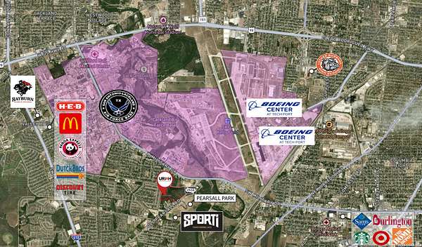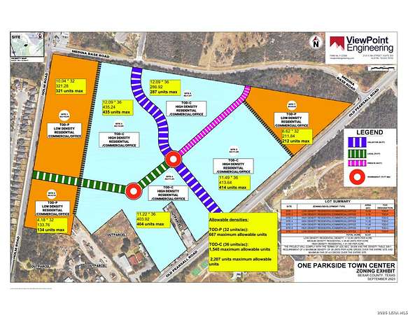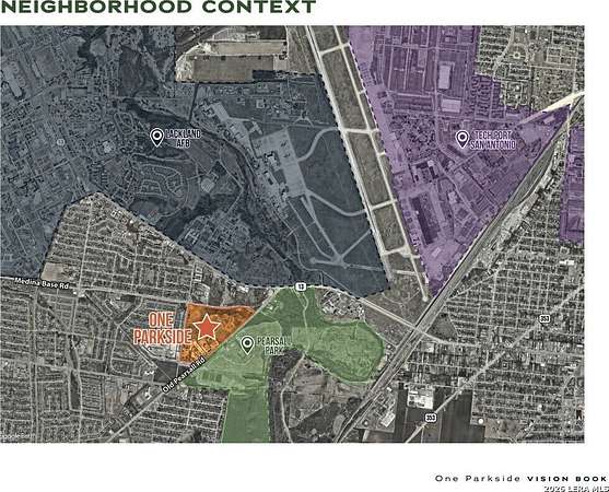 Est $13,127/mo9.82 acre development site on the southwest side of San Antonio, offering prime potential for multifamily housing. This property is ideal for multifamily, duplex, or fourplex development, with ample space to support denser residential projects. It is strategically located near Lackland Air Force Base and Port San Antonio, key drivers of regional employment and long-term housing demand. The area is characterized by ongoing residential expansion and improved connectivity, positioning this site as a valuable asset in a dynamic submarket. It is part of a 70-acre tract with TOD-approved zoning for Transit-Oriented Development, though any illustrated concepts are for potential uses only, with no active development currently underway.