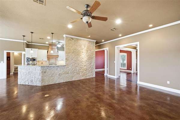 Peaceful country living with room to breathe in Lorena ISD, just minutes from town. This beautifully designed 4 or 5 bedroom, 3.5 bath home sits on 2.663 acres & offers the perfect blend of space, comfort, & functionality. Whether you envision adding a pool, playing ball, or simply enjoying the outdoors, this property delivers wide open possibilities. Inside, the home features both a formal dining room & a breakfast area, giving you room for gatherings big & small. A wall of windows stretches across the back of the home, flooding the living spaces with natural light & offering serene views of the expansive backyard. The kitchen is equipped with granite countertops, custom cabinetry, a large island, gas stove, & refrigerator that conveys, perfect for everyday living & entertaining. A functional built in desk area with shelving provides an ideal space for homework, homeschooling, or a home office, while the mudroom with backpack hooks & storage keeps life organized. The laundry room is close by with a washer & dryer that conveys, room for an extra fridge, & plenty of cabinet and folding space. The isolated primary suite is a true retreat, featuring dual granite vanities, two walk in closets (one built as a storm shelter or panic room), a jacuzzi tub, tile shower with bench, & abundant cabinet space. Plantation shutters add timeless style throughout. Upstairs, a generous bonus room offers flexibility as a fifth bedroom, playroom, or media room. Additional highlights include spray foam insulation, walk in climate controlled attic storage, two tankless gas water heaters, a roof that was replaced in 2023, & a 14 SEER zoned HVAC system. Outdoors, enjoy mature oak trees & a variety of fruit trees: plum, peach, apple, fig, pear, & pecan. A 24' x 16' barn or workshop, three car garage with storage & dual workbenches, circular drive, & spacious covered patio make this property as practical as it is peaceful, perfect for sunset views or morning coffee.