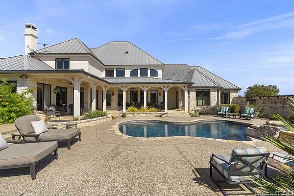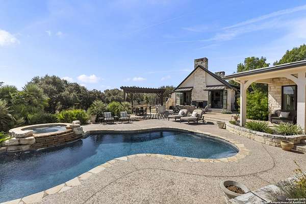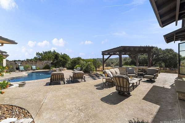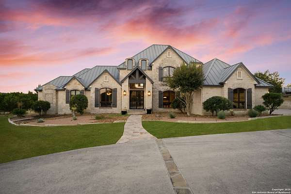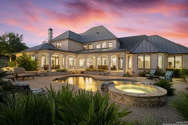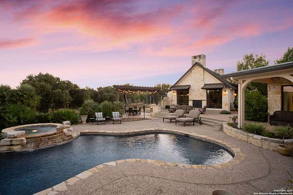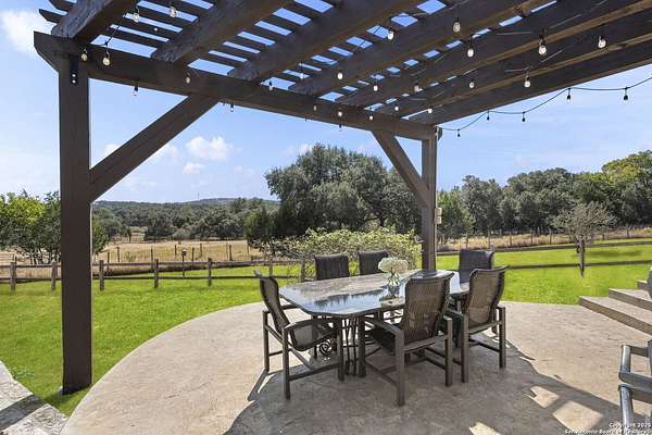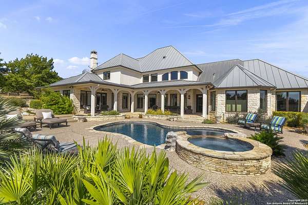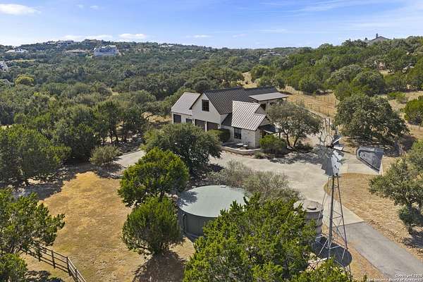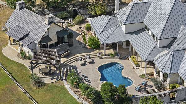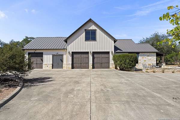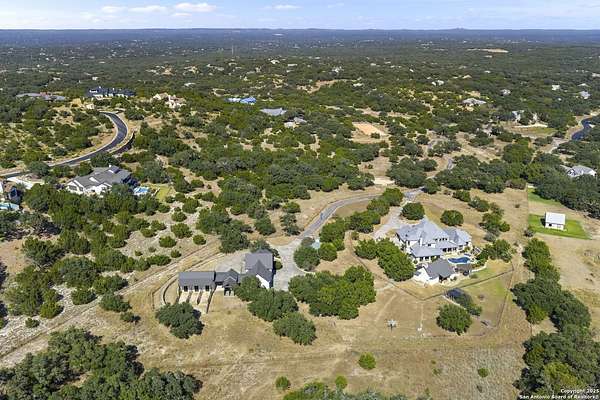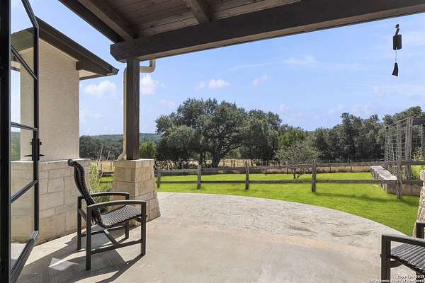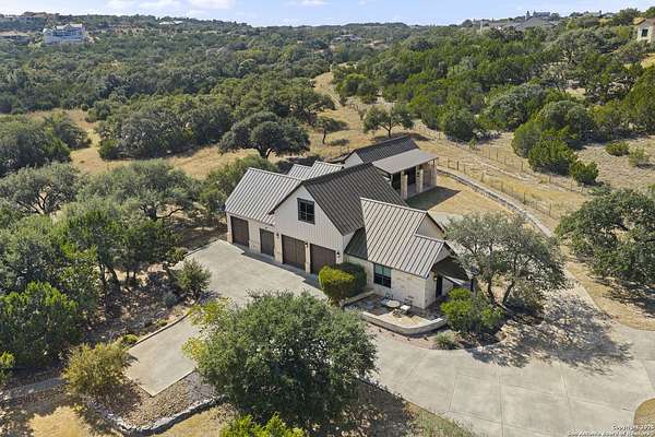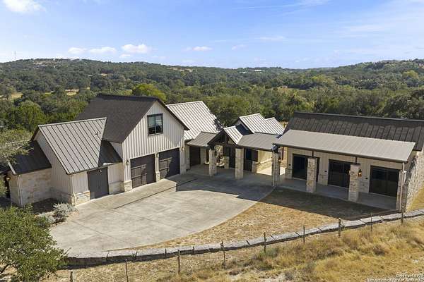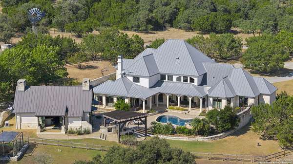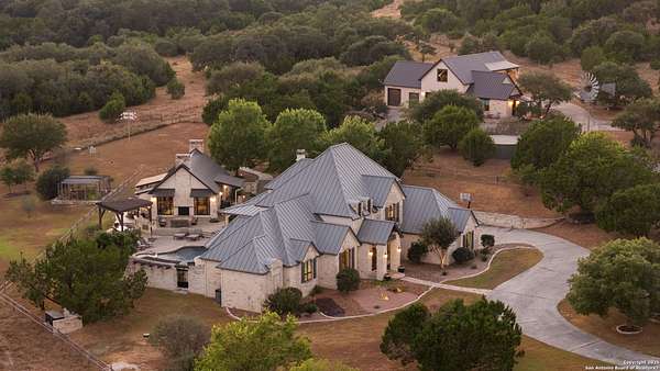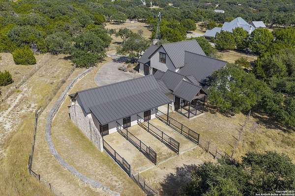 This remarkable 11.5 acre estate offers the utmost in sophisticated living with breathtaking views and a vast array of amenities. The property boasts a 5,472 sq.ft. main residence, a 900 sq.ft. outdoor kitchen pavilion, a 975 sq.ft. garage loft, a 325 sq.ft. guest apartment, three custom horse stalls, and a luxury air-conditioned and heated dog kennels. Sustainable amenities include a 3,000-gallon holding tank, rainwater catchment system, whole-house generator, and a high performing well, all within a privately gated stone-and-iron entry with meandering drives. The custom home embodies timeless appeal combining luxury, functionality and Hill Country charm! No detail was overlooked when this property was designed! Upon entry, you are immediately taken aback by the views and the beauty of the interior! Two-story soaring ceilings to walls of seamless glass windows and transoms, arched entryways, distressed hardwood flooring, ornate chandeliers, furniture style cabinetry, Hunter Douglas shades and striking mouldings; this home has it all. The sprawling floor plan boasts a living room with a towering cathedral ceiling, a formal dining room, private study, game room and a grand flex room that can be tailored to fit your lifestyle. The culinarian is sure to appreciate the island kitchen that was perfectly designed to house all the quintessential cooking elements that one needs. The Viking 6-burner gas range with a double griddle and double ovens is complete with a striking stainless steel Vent-A-Hood. There is an abundance of custom cabinets, workspaces, beautiful backsplashes and a built-in side by side Sub-Zero refrigerator and freezer. For relaxed living, retreat to the grand family room that features a full wet bar, wine refrigerator, ice-maker and cigar humidor. The owner's wing is a private sanctuary with a sitting room, outdoor access, and a spa-worthy bath boasting a freestanding Victoria Albert tub, elegant vanities with designer sconces, and a seamless glass walk-in shower with multiple shower heads and body jets. The custom wardrobe room features a packing island, dust-free cabinets and beautiful finishes making getting ready effortless and enjoyable. Completing the main residence are three secondary bedrooms and an attached two car garage. Once outdoors, you will be in awe of the sprawling grounds and amenities reminiscent of a luxury resort! Enjoy relaxing under the expansive covered patio, in front of the lodge style fireplace or dining under the pergola! When it's time to cool down enjoy a swim in the pool or relaxing evenings in the spa! The soothing pool waterfall and gentle brook set a serene and peaceful ambiance. Adding to the allure of the backyard is the elaborate, one-of-a-kind, outdoor kitchen! Sets of double iron and glass doors open to create an airy and breezy kitchen! Features include a lounging area with a striking stone fireplace, sprawling wraparound sitting bar and a partial bath. The grill master will appreciate this outdoor kitchen complete with a built-in Lynx grill, a Lynx prepping station with double burners and a beverage station with an ice-maker! For the craftsman and workshop enthusiasts, the detached five car garage is well insulated and heated. Enjoy hours of relaxation in the ultimate man cave! Containing a loft for lounging and watching your favorite sporting events. Four oversized garage doors at each end allow for an easy pull-through experience - perfect for RV's, boats or horse trailers. For guests, there is an attached one-bedroom apartment with a kitchenette. Additional amenities include three custom horse stalls each with a turnout, fan, heat lamp, Nelson horse feeder and waterers, a corral and lush pastures. The luxury dog kennels boasts two heated and cooled rooms each with a waterer and a turnout to a covered patio. Come experience refined hill country living at its finest!