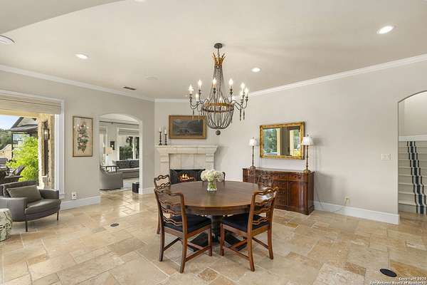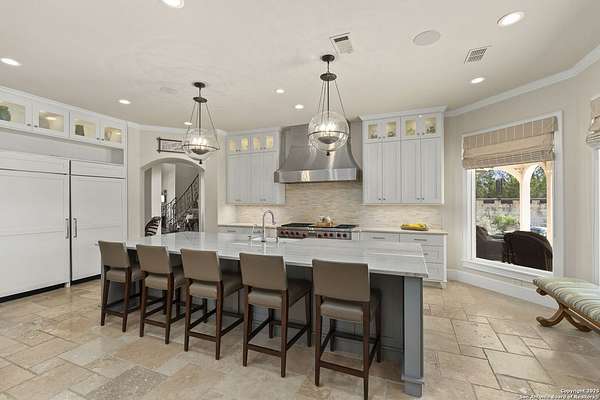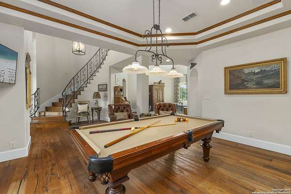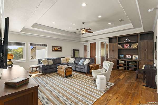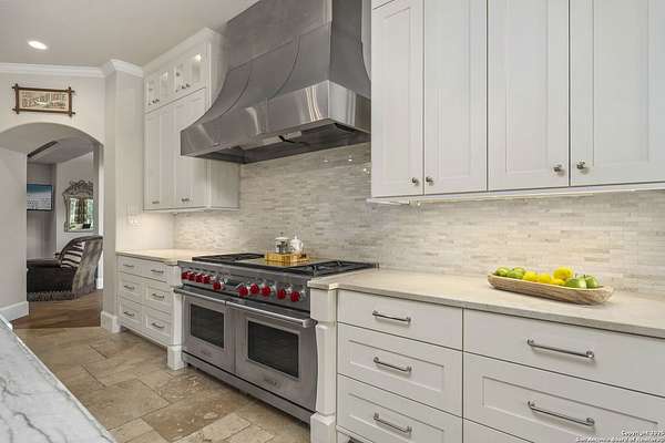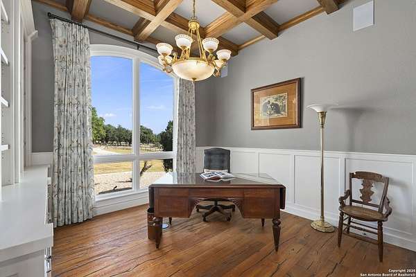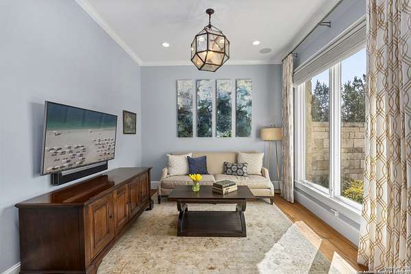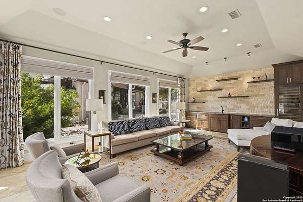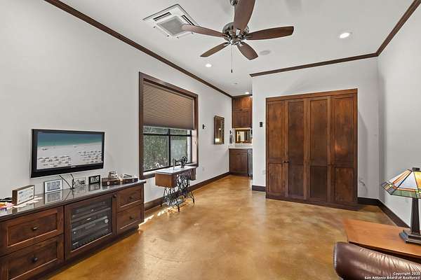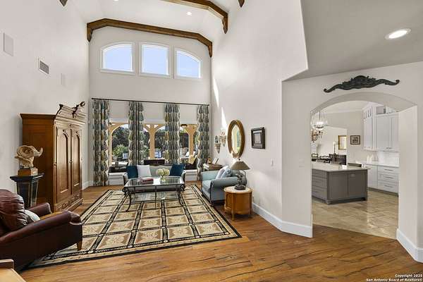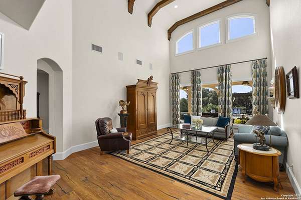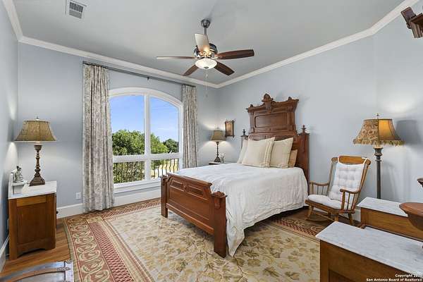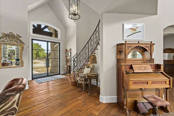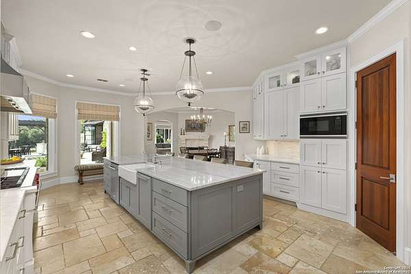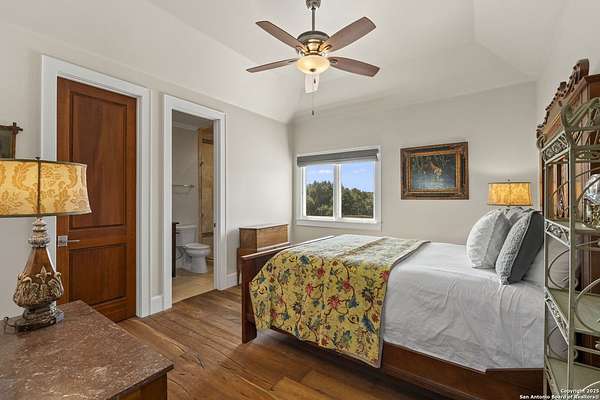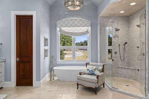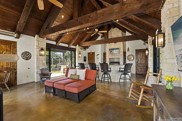 This remarkable 11.5 acre estate offers the utmost in sophisticated living with breathtaking views and a vast array of amenities. The property boasts a 5,472 sq.ft. main residence, a 900 sq.ft. outdoor kitchen pavilion, a 975 sq.ft. garage loft, a 325 sq.ft. guest apartment, three custom horse stalls, and a luxury air-conditioned and heated dog kennels. Sustainable amenities include a 3,000-gallon holding tank, rainwater catchment system, whole-house generator, and a high performing well, all within a privately gated stone-and-iron entry with meandering drives. The custom home embodies timeless appeal combining luxury, functionality and Hill Country charm! No detail was overlooked when this property was designed! Upon entry, you are immediately taken aback by the views and the beauty of the interior! Two-story soaring ceilings to walls of seamless glass windows and transoms, arched entryways, distressed hardwood flooring, ornate chandeliers, furniture style cabinetry, Hunter Douglas shades and striking mouldings; this home has it all. The sprawling floor plan boasts a living room with a towering cathedral ceiling, a formal dining room, private study, game room and a grand flex room that can be tailored to fit your lifestyle. The culinarian is sure to appreciate the island kitchen that was perfectly designed to house all the quintessential cooking elements that one needs. The Viking 6-burner gas range with a double griddle and double ovens is complete with a striking stainless steel Vent-A-Hood. There is an abundance of custom cabinets, workspaces, beautiful backsplashes and a built-in side by side Sub-Zero refrigerator and freezer. For relaxed living, retreat to the grand family room that features a full wet bar, wine refrigerator, ice-maker and cigar humidor. The owner's wing is a private sanctuary with a sitting room, outdoor access, and a spa-worthy bath boasting a freestanding Victoria Albert tub, elegant vanities with designer sconces, and a seamless glass walk-in shower with multiple shower heads and body jets. The custom wardrobe room features a packing island, dust-free cabinets and beautiful finishes making getting ready effortless and enjoyable. Completing the main residence are three secondary bedrooms and an attached two car garage. Once outdoors, you will be in awe of the sprawling grounds and amenities reminiscent of a luxury resort! Enjoy relaxing under the expansive covered patio, in front of the lodge style fireplace or dining under the pergola! When it's time to cool down enjoy a swim in the pool or relaxing evenings in the spa! The soothing pool waterfall and gentle brook set a serene and peaceful ambiance. Adding to the allure of the backyard is the elaborate, one-of-a-kind, outdoor kitchen! Sets of double iron and glass doors open to create an airy and breezy kitchen! Features include a lounging area with a striking stone fireplace, sprawling wraparound sitting bar and a partial bath. The grill master will appreciate this outdoor kitchen complete with a built-in Lynx grill, a Lynx prepping station with double burners and a beverage station with an ice-maker! For the craftsman and workshop enthusiasts, the detached five car garage is well insulated and heated. Enjoy hours of relaxation in the ultimate man cave! Containing a loft for lounging and watching your favorite sporting events. Four oversized garage doors at each end allow for an easy pull-through experience - perfect for RV's, boats or horse trailers. For guests, there is an attached one-bedroom apartment with a kitchenette. Additional amenities include three custom horse stalls each with a turnout, fan, heat lamp, Nelson horse feeder and waterers, a corral and lush pastures. The luxury dog kennels boasts two heated and cooled rooms each with a waterer and a turnout to a covered patio. Come experience refined hill country living at its finest!