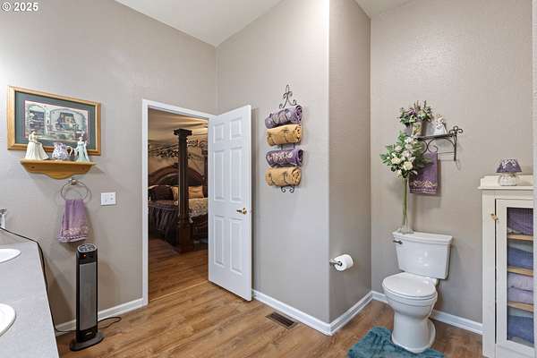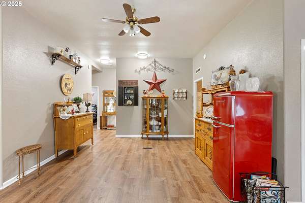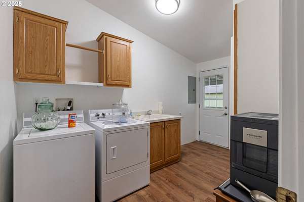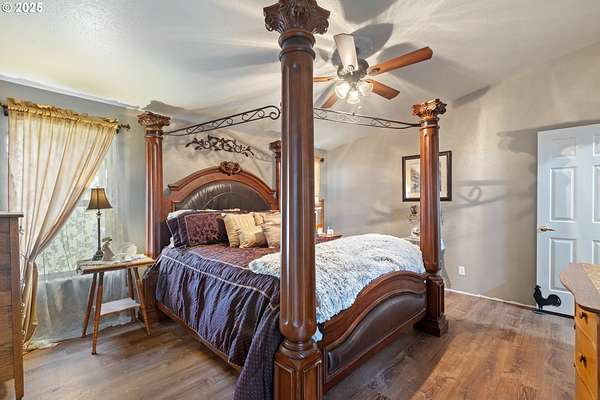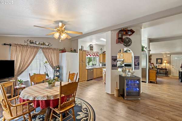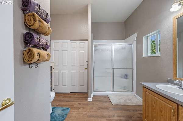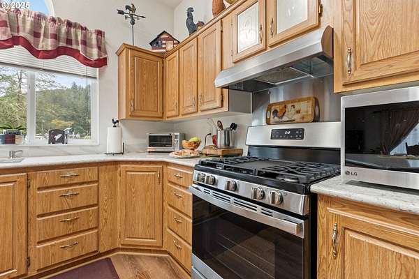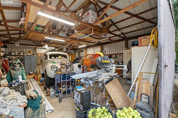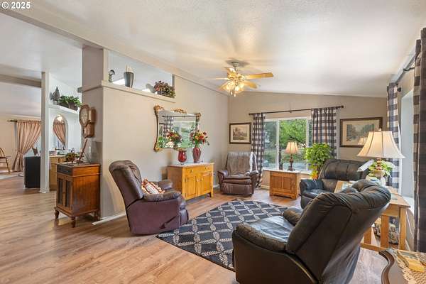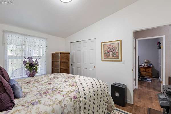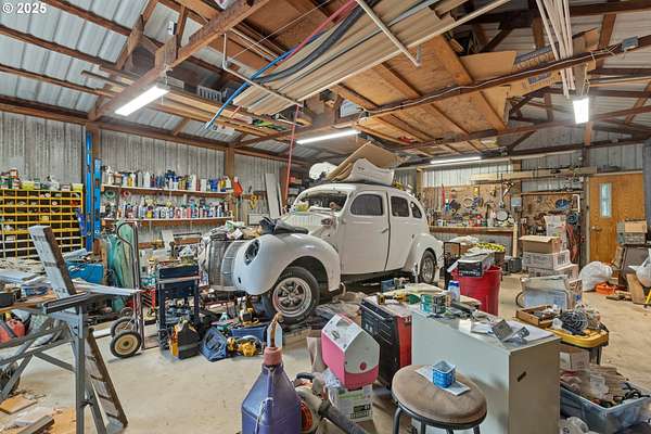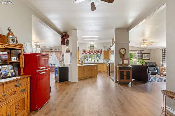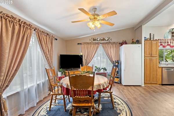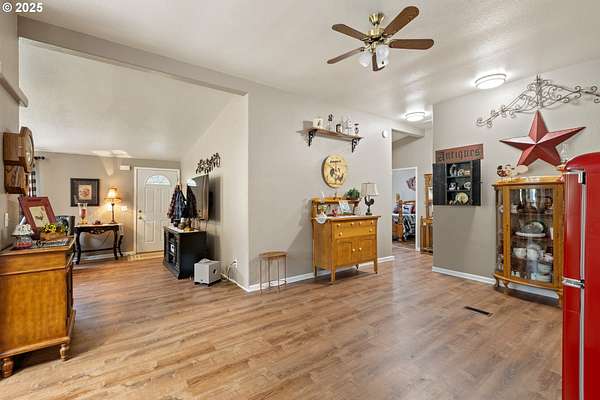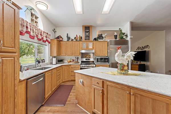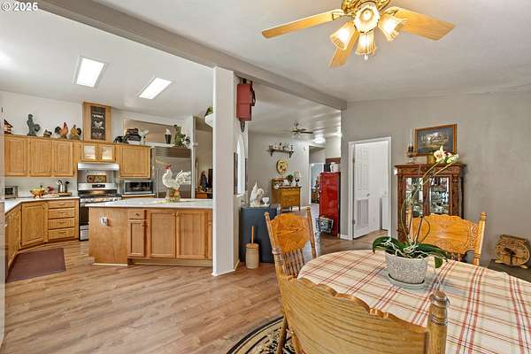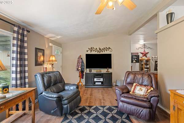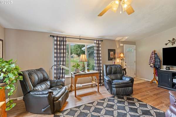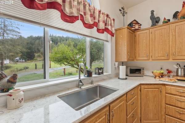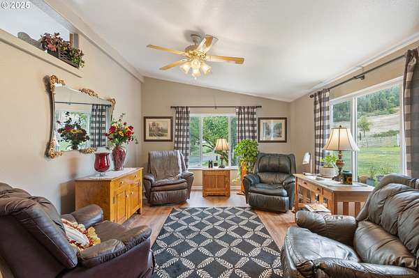 Enjoy peaceful living on 8.38 acres at 5041 N Myrtle Rd. This 3-bedroom, 2-bath home features vaulted ceilings and stunning farm views. The kitchen includes quartz countertops, a large island, and a stainless steel gas range. New guest quarters with laminate flooring and climate controlled mini-split ductless system offer added comfort with ample storage space. Relax on the covered porch or spacious patio overlooking open pastures, ideal for farming or raising animals. The upper field includes approximately 2.6 acres of valuable irrigation water rights, dating back to 1917. Additional features include a concrete-floored shop, barn with chicken coop, ample parking, and RV hookups. Unwind beside the serene, North Myrtle Creek that gently borders the property, a perfect backdrop for peace and relaxation. This property combines comfortable living, functional outbuildings, and plenty of land, perfect for a rural lifestyle with modern conveniences.