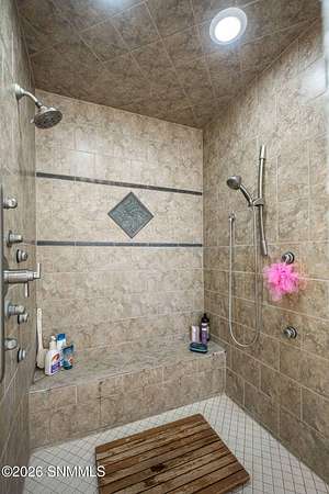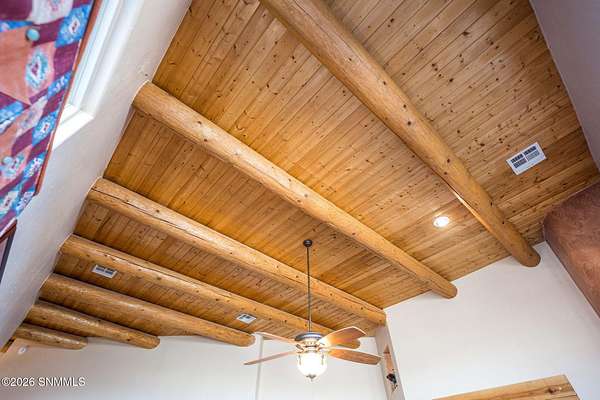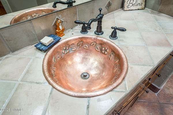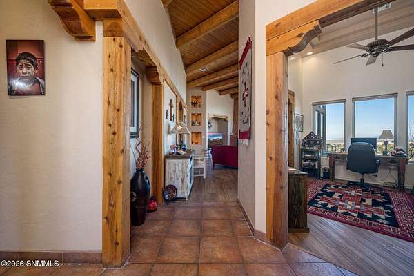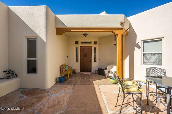 Your desert oasis awaits. This stunning Southwest residence is perfectly sited on 2.53 acres, offering sweeping mountains, sparkling city lights, and unforgettable sunset views. With abundant space and natural surroundings, you'll enjoy the beauty of desert wildlife and the serenity of wide-open skies-all from the comfort of home. Enter through the charming front courtyard and step into 3,397 square feet of thoughtfully designed living space. The gourmet kitchen is a chef's dream, featuring a Wolf oven, Sub-Zero refrigerator, granite countertops, a center island with prep sink, pantry, and a skylight that fills the space with natural light. The living room showcases soaring wood-beamed ceilings with classic vigas, a cozy Kiva fireplace with wood pellet insert, and distinctive nichos that add authentic Southwestern character. The spacious primary suite with its own Kiva fireplace and beautiful Saltillo tile floors.