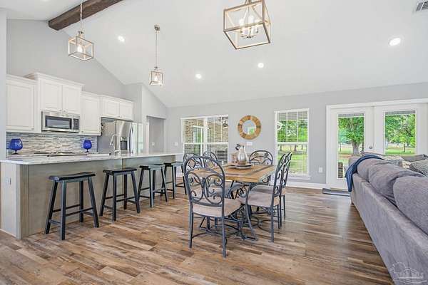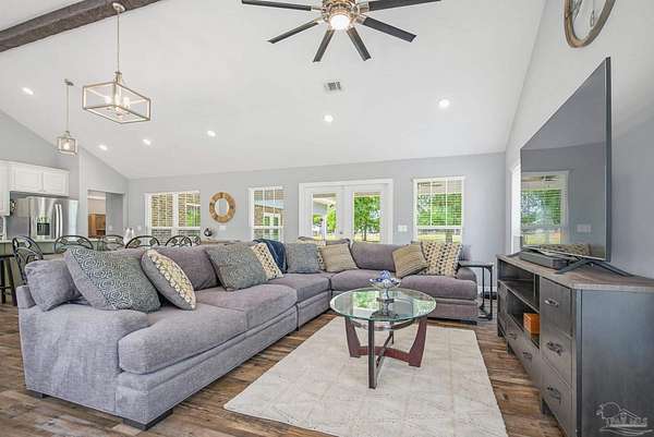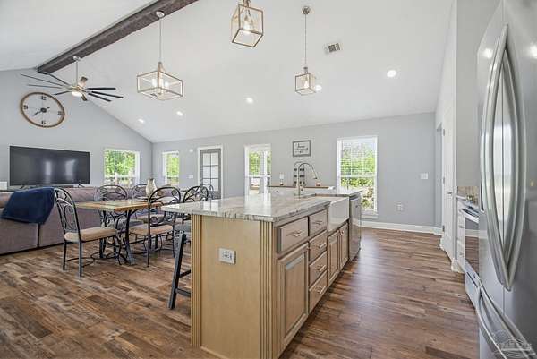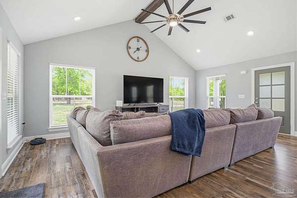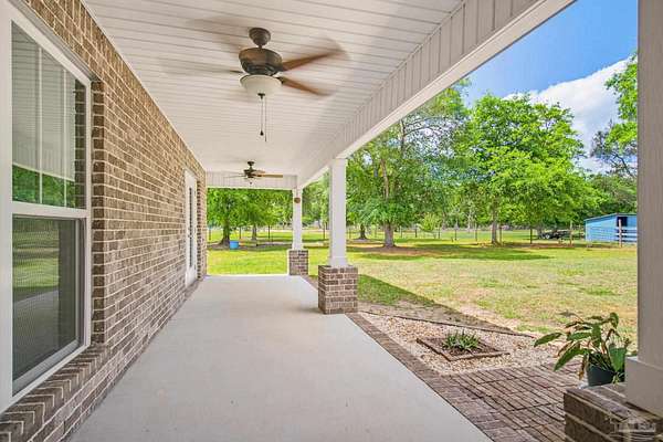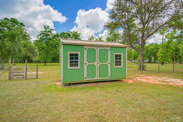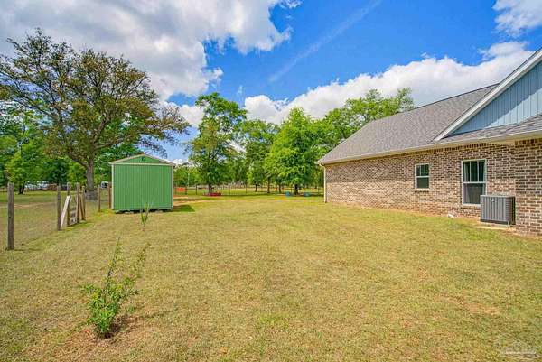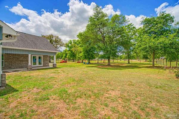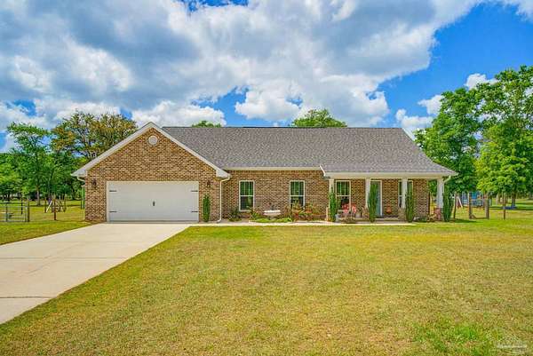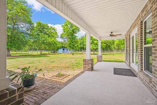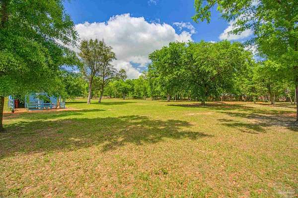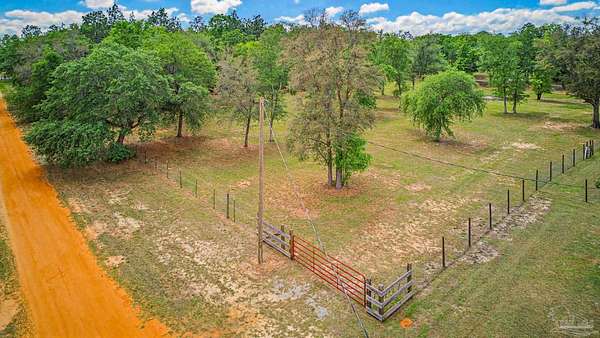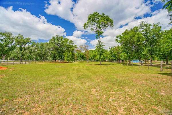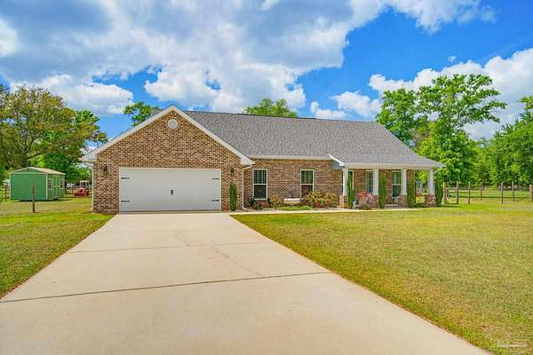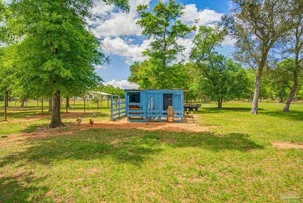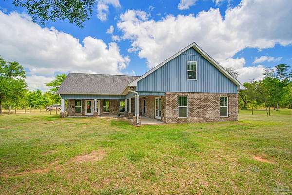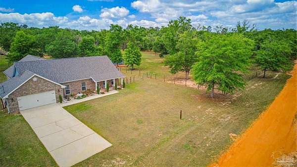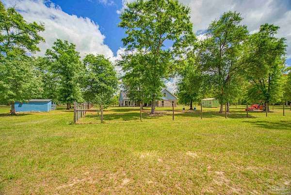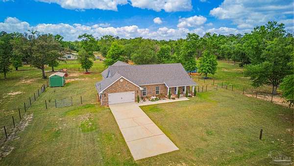 Welcome to your own private slice of country paradise-just under 30 minutes from the white sandy shores of Navarre Beach. Nestled on over 4 acres, this beautifully maintained 2020-built home offers the perfect blend of modern comfort and peaceful rural living. Step inside to an inviting open-concept layout where the kitchen, dining, and living areas flow seamlessly beneath soaring vaulted ceilings-ideal for both everyday living and entertaining. The kitchen is a standout, featuring stunning marble countertops, a large island, and ample space for gathering. Continuous luxury vinyl flooring runs throughout the home, adding both durability and style. The spacious primary suite offers a relaxing retreat and opens directly onto the covered patio, creating a seamless indoor-outdoor connection perfect for quiet mornings or evening relaxation. Out back, a covered patio spans the entire length of the home-an incredible feature that creates an expansive space for entertaining, relaxing, or taking in the peaceful surroundings year-round. The property truly shines with established paddocks and a charming chicken coop, making it ready for your homesteading dreams. With plenty of land, there's ample space to store boats, RVs, or even add a pool. Upstairs, you'll find another bedroom and a versatile bonus room that can easily serve as a fourth bedroom, home office, or flex space to suit your needs. Surrounded by tranquility and wide-open space, this property delivers the peace and quiet you've been searching for without sacrificing convenience to the coast. Whether you're looking for room to roam, hobby farm potential, or simply a serene lifestyle, this one checks all the boxes.