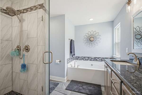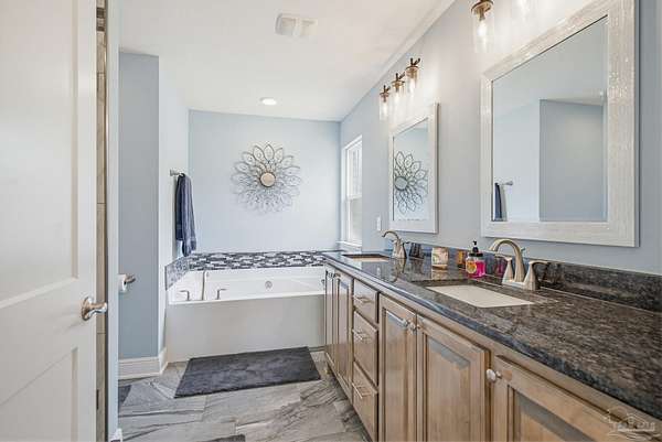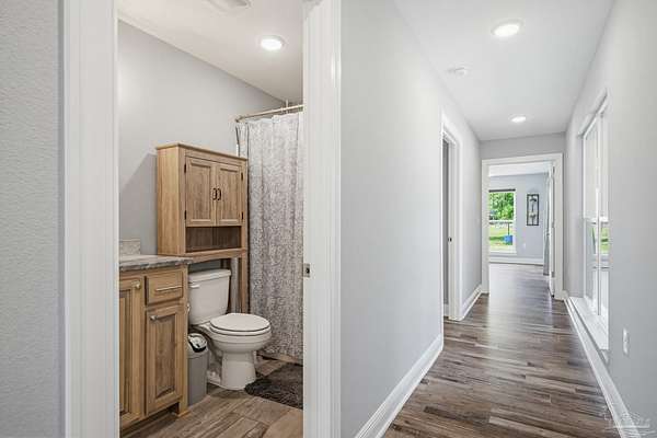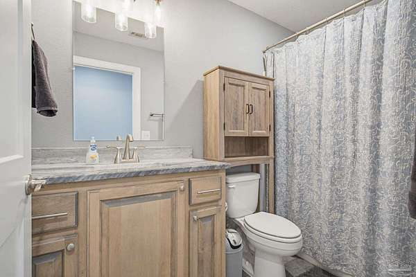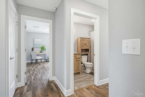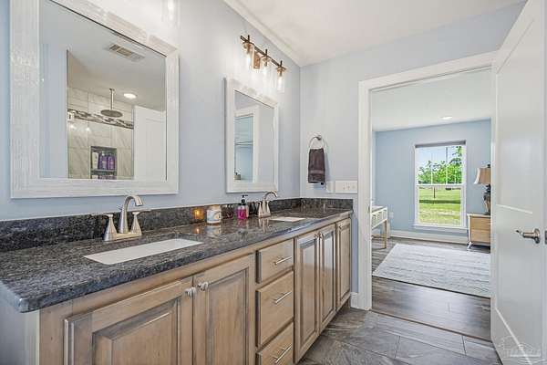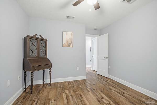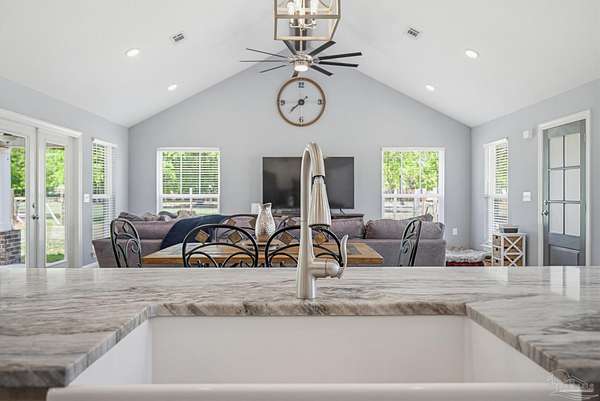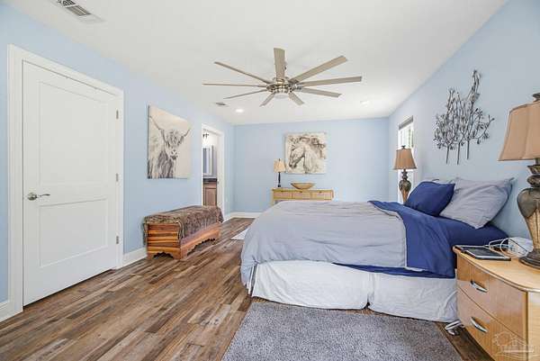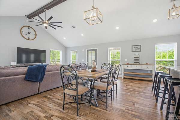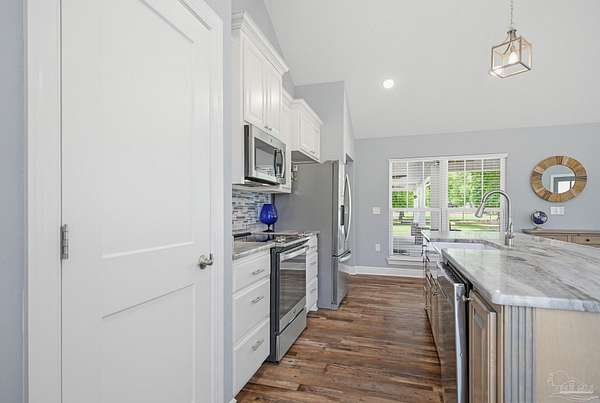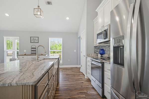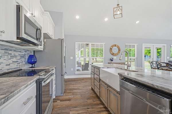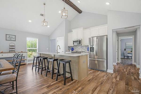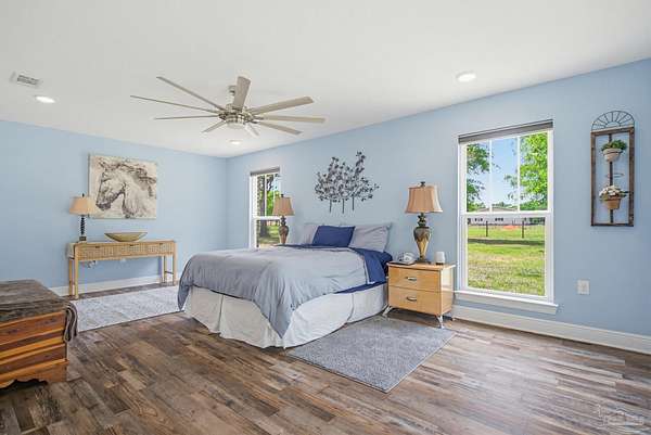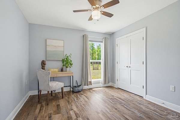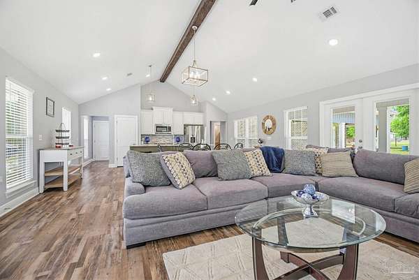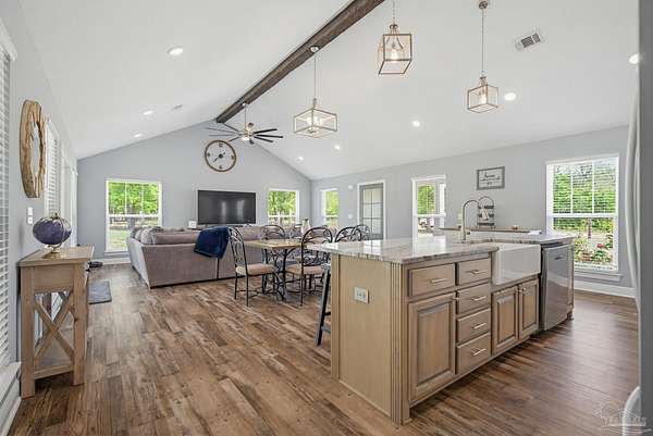 Welcome to your own private slice of country paradise-just under 30 minutes from the white sandy shores of Navarre Beach. Nestled on over 4 acres, this beautifully maintained 2020-built home offers the perfect blend of modern comfort and peaceful rural living. Step inside to an inviting open-concept layout where the kitchen, dining, and living areas flow seamlessly beneath soaring vaulted ceilings-ideal for both everyday living and entertaining. The kitchen is a standout, featuring stunning marble countertops, a large island, and ample space for gathering. Continuous luxury vinyl flooring runs throughout the home, adding both durability and style. The spacious primary suite offers a relaxing retreat and opens directly onto the covered patio, creating a seamless indoor-outdoor connection perfect for quiet mornings or evening relaxation. Out back, a covered patio spans the entire length of the home-an incredible feature that creates an expansive space for entertaining, relaxing, or taking in the peaceful surroundings year-round. The property truly shines with established paddocks and a charming chicken coop, making it ready for your homesteading dreams. With plenty of land, there's ample space to store boats, RVs, or even add a pool. Upstairs, you'll find another bedroom and a versatile bonus room that can easily serve as a fourth bedroom, home office, or flex space to suit your needs. Surrounded by tranquility and wide-open space, this property delivers the peace and quiet you've been searching for without sacrificing convenience to the coast. Whether you're looking for room to roam, hobby farm potential, or simply a serene lifestyle, this one checks all the boxes.