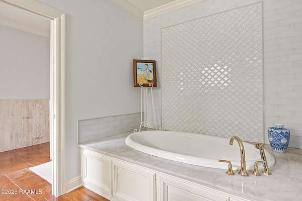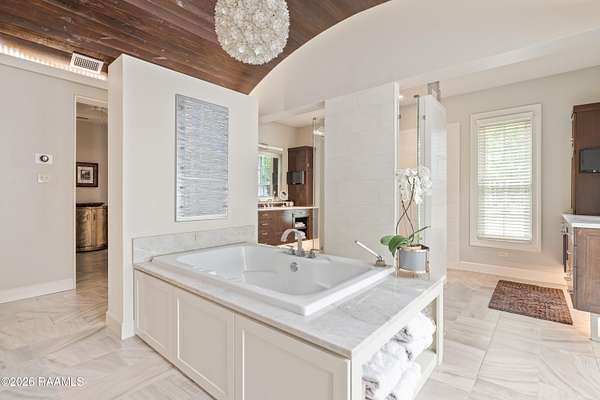 - 9+ ft Ceiling, Beamed Ceilings, Bookcases, Built-In Features, Built-Ins, Cathedral Ceiling, Cathedral Ceiling(s), Crown Molding, Double Vanity, Electric Dryer Con, Garden Tub, High Ceilings, Primary Bath, Separate Shower, Varied Ceiling Heights, Walk-In Closet(s), Wet Bar, Whirlpool