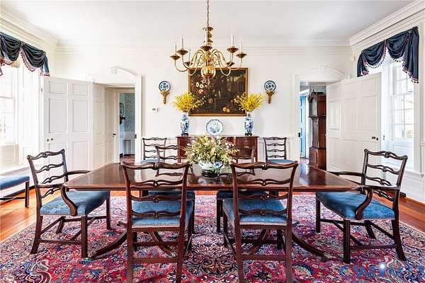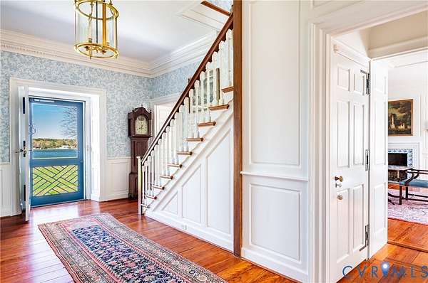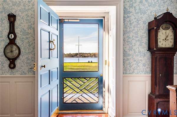 Perfectly perched on a bluff along the south bank of the Piankatank River, "Providence" is a landmark estate tracing back to origins of a land patent granted in 1652 by Colonel George Ludlow. Believed to be built in 1754 by William Fitchett, this stunning Georgian Colonial w/flemish bond brickwork unfolds across 123 acres & 1,100' of sandy beach shoreline. Over time, Providence has been shaped by a small number of dedicated stewards. The main residence boasts generously proportioned paneled rooms & high ceilings, two symmetrical wing additions c1980s, currently boasts ~5,820sqft of gracious living space & picturesque water views. Entering the front-to-back foyer, on the left is the living room w/marble fireplace, custom millwork & built-ins leading to the first floor primary wing complete w/fp, rose quartz ensuite bath & walk-in cedar closet. On the right is the dining room with shell vitrines, delft tile fp & powder room. Passing through a wet bar w/butler's pantry is the eat-in kitchen featuring a custom copper range hood, oversized fp, side keeping room & additional powder room. The 2nd level hosts 3 ensuite guest suites & 3rd level hosts 2 additional ensuite guest suites ~ all with river views. An english basement showcases a den w/original beamed ceiling, fp, built-ins, exterior access, half bath & utility rooms. The grounds include remnants of a Charles Gillette garden, newer gunite pool w/600sqft pool house, smoke & pump houses, 2,200sqft 3-bay garage w/guest quarters, 1,500sqft 3BR river cottage, 1,300sqft farmhouse & 2,400sqft barn. At the water's edge is a ~285' dock accessing the deep-water channel leading 9 miles out to the Chesapeake Bay. From sunrise fishing & sunset sailing to crisp days of hunting & warm days of gardening, this is a lifestyle defined by rhythms of coastal Virginia. Within reach of local marinas, yacht & country clubs, Providence offers both privacy & a quietly vibrant social backdrop while proximity to Norfolk, Richmond & Washington, DC ensures convenience without compromise.