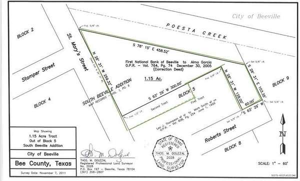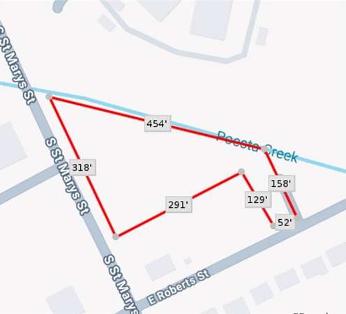 Est $181/mo505 S Saint Marys St, Beeville, TX 78102 TWO LOTS (2) - 41,469 sqft + Second Tract 8,607 sqft = 50,076 sqft TOTAL of 1.15 acres ( Reference Survey ) Residential Lot for sale $25,000 for all of it. Currently zoned residential, this property looks potentially like commercial based on all commercial surrounding this lot. A creek bed is to one side of this Land for you to build your home or business. Ask the city for what is allowed per zoning on the 1.15 of an acre