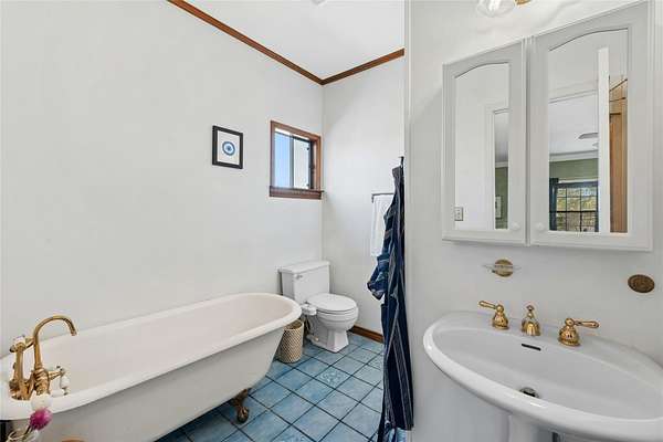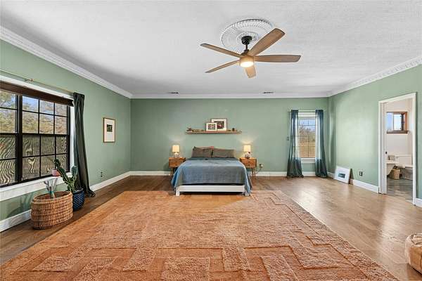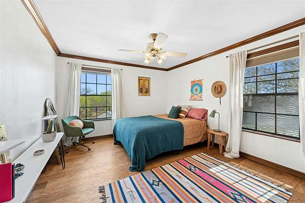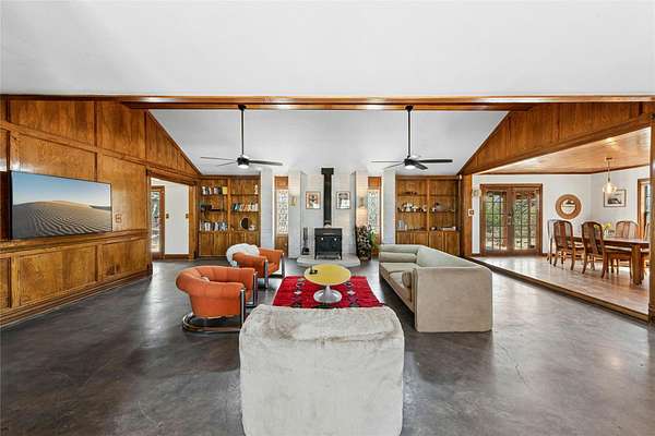 - Beamed Ceilings, Bookcases, Built-In Features, Crown Molding, Interior Steps, Multiple Living Areas