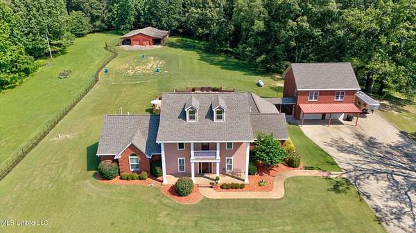 This one-of-a-kind estate sits on 16.32 acres of well-kept land and features a 3,694 sq ft main home & 1,004 additional sq ft on the detached. Built for comfort, function, and entertaining. Inside, the kitchen is a standout with granite countertops, gas cooktop, double ovens, a large island with bar seating, and plenty of cabinet space-all open to the main living areas. The oversized den features full wood paneling, custom built-ins, and a wall of windows overlooking the backyard. The primary suite includes a large sitting area, vaulted ceiling, and a spacious bath with double vanities, soaking tub, and walk-in closet. Step outside to your own private retreat: a fully fenced saltwater pool with fountains, multiple lounge areas, and a covered patio for relaxing or hosting. A 1,004 sq ft guest house with 1 large studio bedroom, full bathroom, full kitchen, and private garage adds flexibility for guests. Additional amenities include a four-stall barn, a workshop with roll-up doors, and a private pond spanning approximately 5 acres-ideal for fishing, quiet mornings, or watching wildlife. With space to spread out and everything in place, this property offers the perfect blend of peaceful living and practical luxury! Property Lines are approximate, please see the survey.