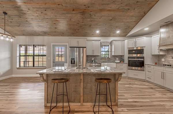 rand-new custom home sitting on 13+/- acres offering privacy, space, and quality craftsmanship throughout. Openconcept floor plan perfectly designed for modern living. The kitchen features upgraded solid wood cabinetry, stone countertops, and stainless steel appliances that combine durability with style. Both Bathrooms complete with solid wood cabinets and stone countertops. Primary Bathroom has Beautiful walk-in Tiled Shower with bench, soaking tub, and his and her Vanities and walk-in Closets. Spacious mudroom with sink, and second back exterior door, perfect for country living convenience. This home is built to last, with steel construction, a durable metal roof, and spray foam insulation for maximum energy efficiency and comfort year-round. Whether you're looking for peaceful country life or a high-quality new build with multiple upgrades, this property has it all. Beautiful design and Quality materials with Room to breathe.