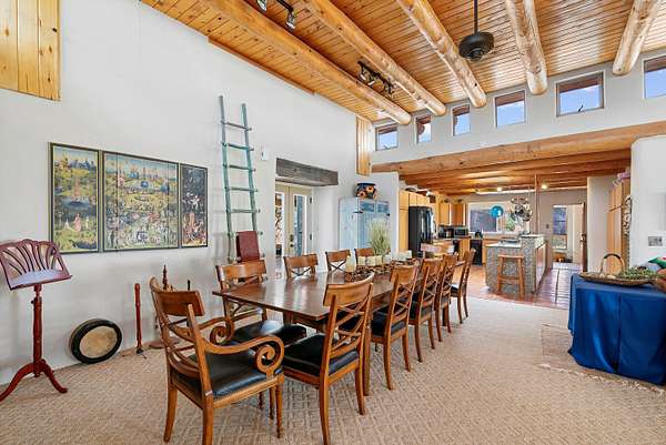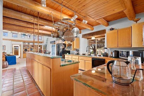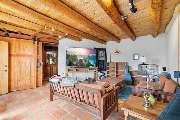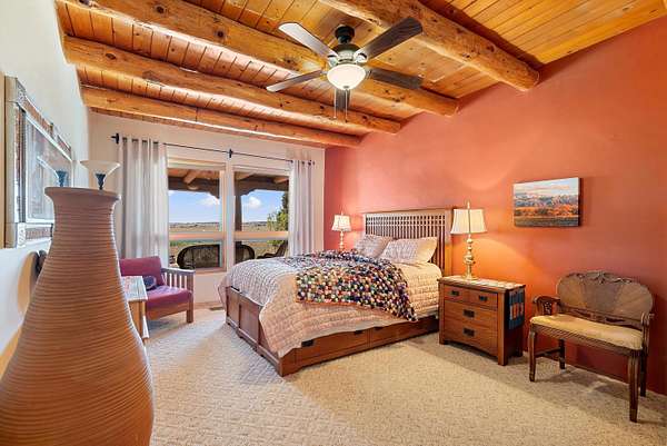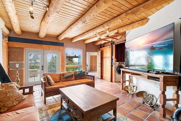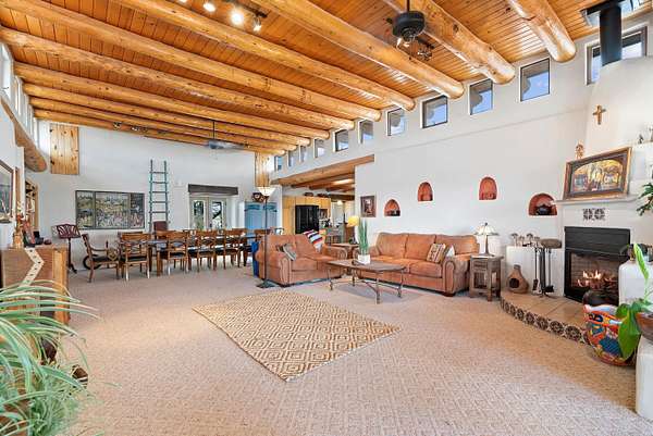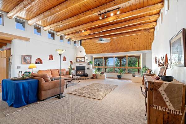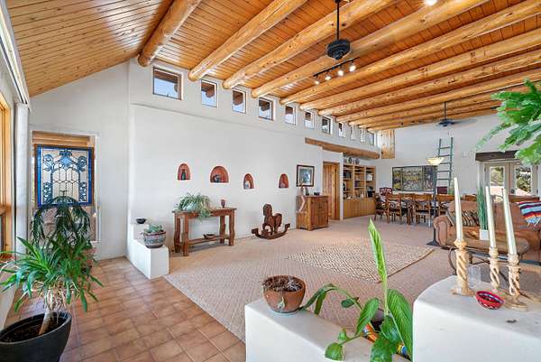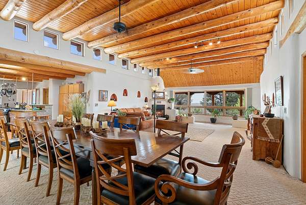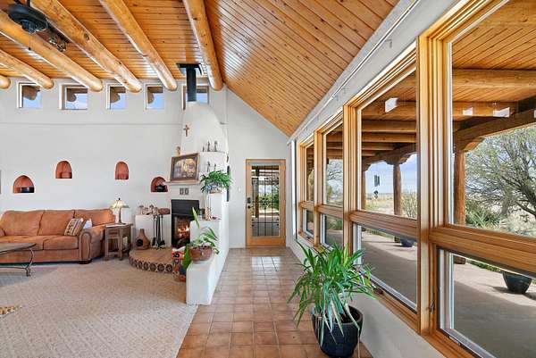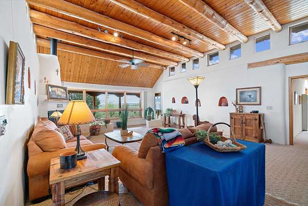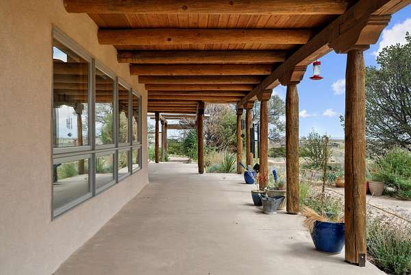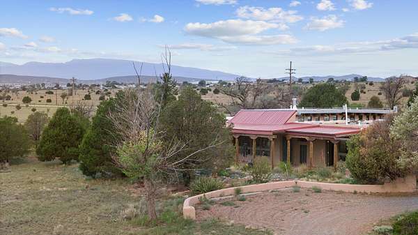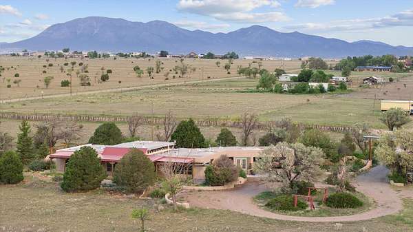 Discover the charm and essence of New Mexico in this custom home, set on a serene 7.5-acre lot. With 3-foot-thick walls, exposed viga beams, and pine ceilings, this home blends traditional craftsmanship with modern comfort. The expansive great room boasts high ceilings, creating an open and airy atmosphere. The spacious bedrooms, versatile kitchenette, and large country kitchen with custom countertops. Enjoy the outdoor areas to take in 360 degree views. 2400sqft+ workhop provide versatil