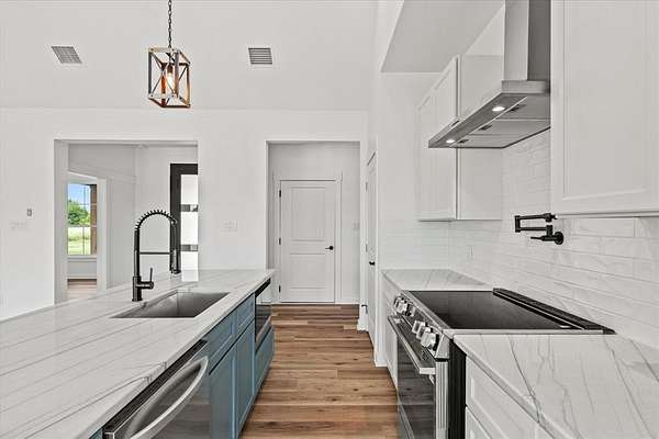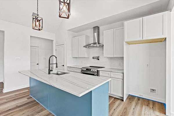 The gourmet kitchen features a large island with deep farmhouse sink, quartz countertops, high-end J&K cabinetry, and decorative pendant lighting--perfect for everyday living or entertaining.