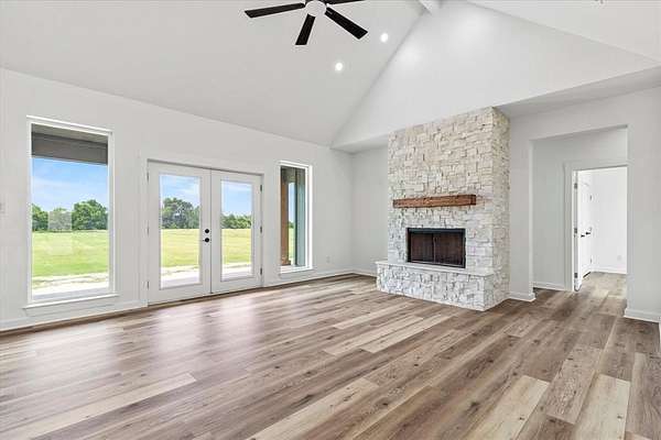 The heart of the home is the open-concept living space, highlighted by soaring vaulted ceilings, oversized windows, and glass doors that flood the home with natural light and showcase views of the covered patio, trees, and tranquil creek. A gorgeous stone fireplace anchors the living room with warmth and charm.
