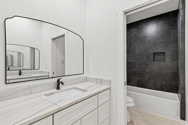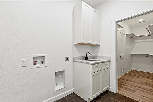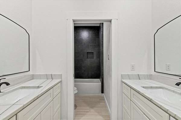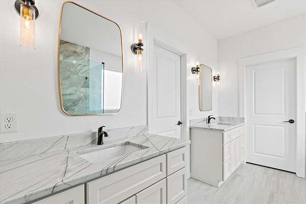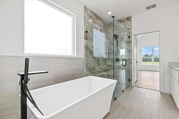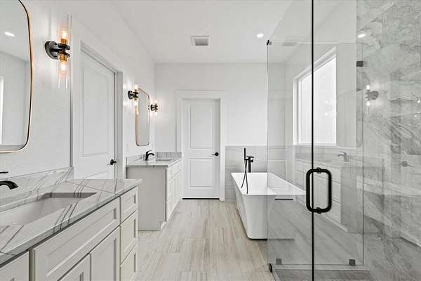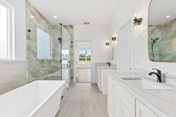 The luxurious primary suite offers a spa-style bathroom with a freestanding tub, oversized walk-in shower, and dual vanities. It connects directly to a spacious walk-in closet and functional utility room for seamless flow.