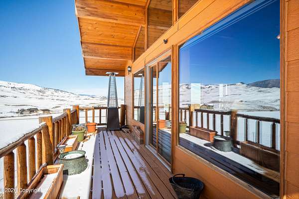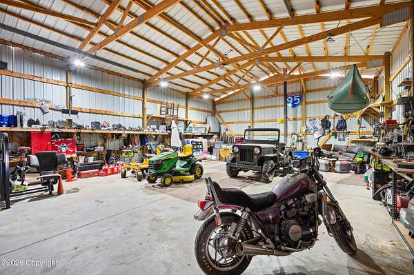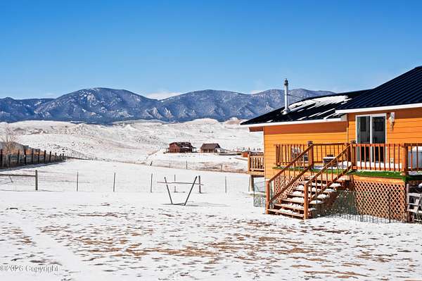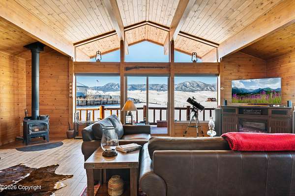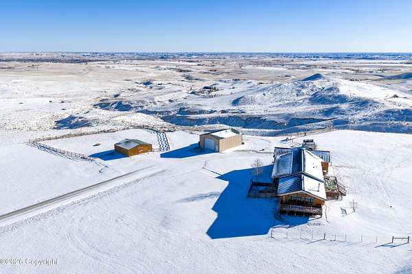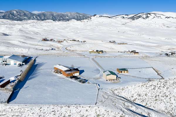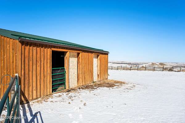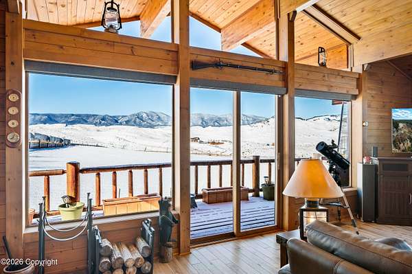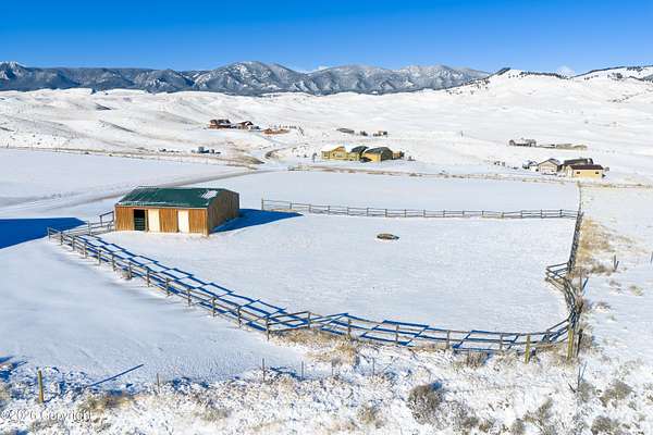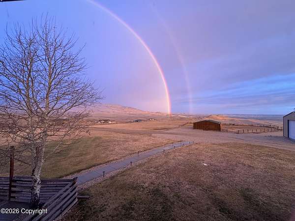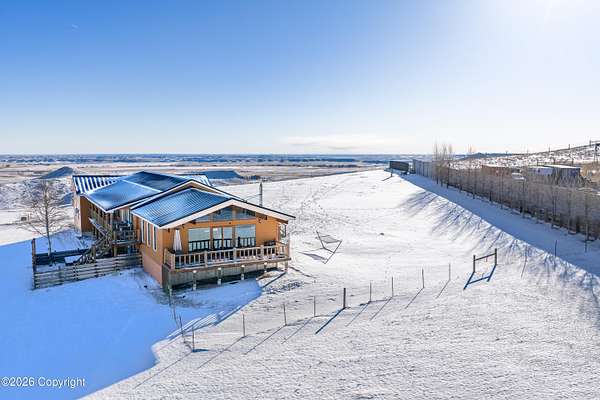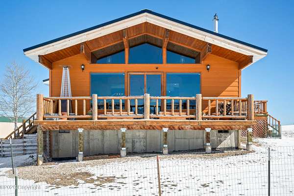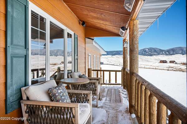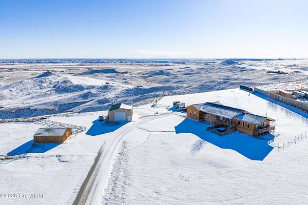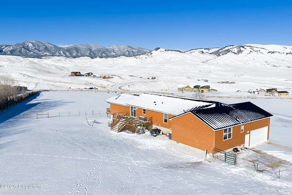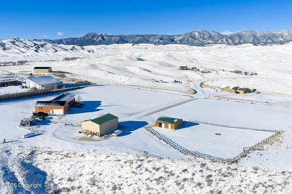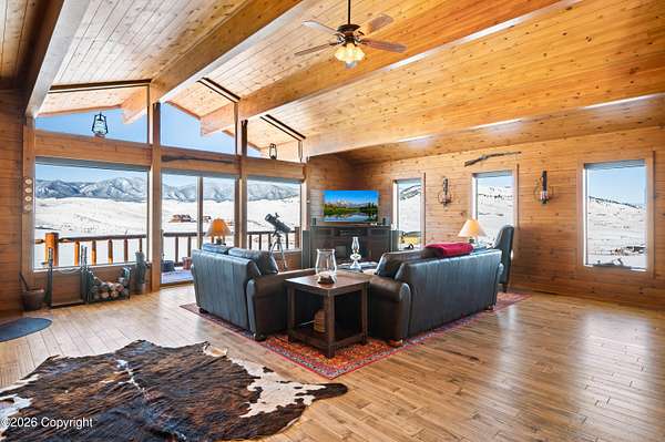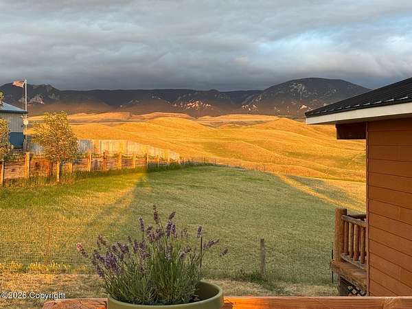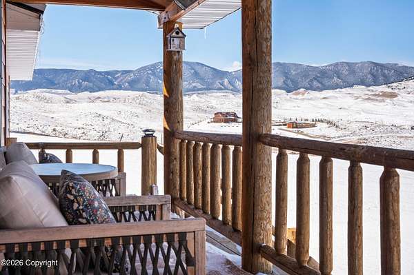 Perched high above the storybook town of Buffalo, where the mountains rise boldly in front of you and endless prairie stretches for miles behind, this is more than a home--it's your private Wyoming escape. From sunsets over the peaks to starlit nights in your heated travertine patio jacuzzi, every inch of this 3,700 sq ft retreat was built to impress, endure, and invite you to stay just a little longer. Designed for both rugged living and refined comfort, the property is fully grazeable--cleared, pristine, and ready for horses, kids, or both. A fully equipped 3-stall barn with power, tack room, washdown station, and trot yard makes this a dream for equestrians, and thousands of acres of public land are walking distance . The massive heated Cleary steel shop and 50-amp RV hookup offer... unmatched versatility for work, toys, or guests. Step inside and the tone shifts to elevated luxury-- 3/4" hardwood floors, custom stonework, and a chef's kitchen anchored by premium quartz countertops. Entertain effortlessly with your own Irish pub and wet bar, or settle in for movie night in the 7.2 surround sound home theater. Every bedroom captures sweeping mountain views, while remote-controlled blinds add a touch of modern convenience. Three elevated decks frame panoramic vistas in every direction. Beneath it all, thoughtful upgrades ensure peace of mind: freeze-proof PEX plumbing, whole-home water filtration and softening, prewiring for a remote generator, and even a reinforced cinderblock tornado room. And perhaps best of all--no HOA. No compromises. Just wide-open freedom wrapped in rugged luxury. Whether you're seeking self-sufficiency, space to roam, or a place that simply takes your breath away every single day... this is it. By appointment only. Homes like this don't wait--and neither should you. Reach out to April Poley, the listing agent,, for the amenities list and additional information.