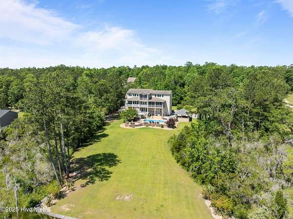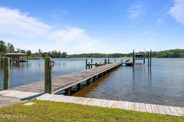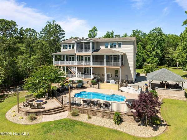 This is the house with everything! On nearly 5 acres this excellent property has all you could want in private luxury waterfront including heated saltwater pool, outdoor kitchen, bulkhead, private dock & pier, 2 boat lifts, whole-home generator, elevator serving all floors & wired separate workshop. The main level features gorgeous hardwood floors, private primary suite w/ separate HVAC, huge bath w/soaking tub, double shower & 2 walk-in closets + screened porch overlooking the pool & waterfront. The living area boasts a soaring cathedral ceiling & includes a well-appointed kitchen w/custom cabinets, granite counters & SS appliances, new fridge, dishwasher & built-in microwave (2023). Just beyond the breakfast bar is the greatroom w/ stone fireplace & wall of windows overlooking the water. This floo also features formal dining room, den & powder room. The ground floor offers 2 private guest bedrooms w/2 full baths, huge laundry room + gym/flex space. On the 3rd floor you'll find a large study w/built-ins & another full bath + bonus room/4th BR. Multi-level porches & decks cover the water-facing side of the house & the ground level opens to a deluxe outdoor kitchen. The discerning buyer will appreciate the long list of value-adds incl. updated wiring to pier/lifts, piped-in firepit, 4 HVAC units serviced 2xyr, hurricane-rated 50-year roof, SONOS sound system, 2 tankless H2O heaters, water filtration system, Trex decks, Certain-teed cedar-look siding w/ Panel Thermometer to withstand hurricane-force winds, hi-speed fiber, irrigation system, new river rock beds & gravel parking area, heated/cooled garage. 30 mi to two regional airports, 130 mi to RDU, 60 mi to the sandy beaches of NC's Crystal Coast. You'll never run out of ways to chill in this stellar waterfront retreat!