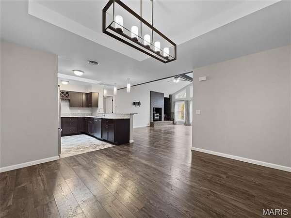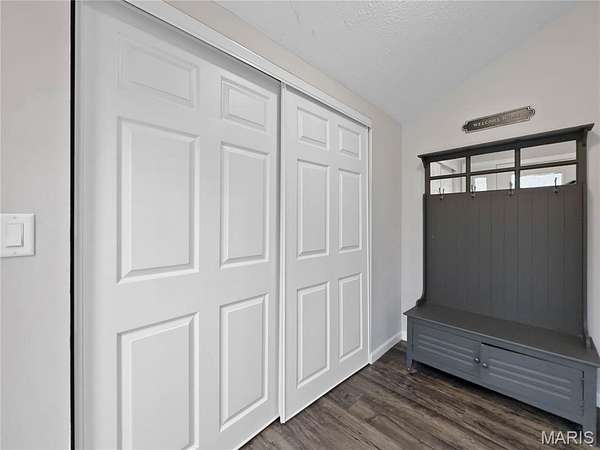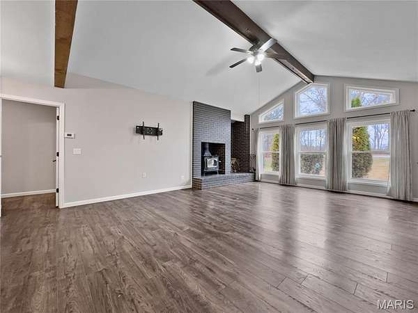 Step into the formal foyer and you'll immediately notice the new LVP flooring throughout. The vaulted living room features rustic beams, a fireplace with wood burning insert, and a wall of windows that flood the space with natural light and frame the wooded views. You will be watching that beautiful snow fall dreaming of snow days and play. The remodeled kitchen offers abundant storage, granite countertops, pendant lighting, stainless steel appliances, and a clear sightline straight through the home--perfect for enjoying the scenery while you cook. The split floor plan places the primary suite on one side and two secondary bedrooms with a full remodeled bath on the other. The primary suite includes sliding glass doors to a private patio/yard area, a French door framed walk in closet, and an ensuite with antique double bowl vanity and tub/shower combo. A spacious laundry room with drop zone provides the ideal spot to kick off muddy boots after a day outdoors.