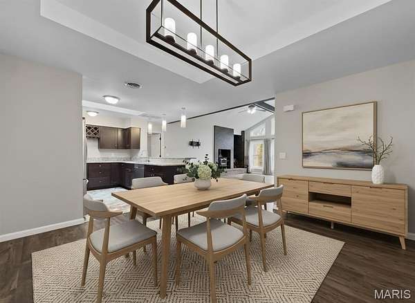 Step into the formal foyer and you’ll immediately notice the new LVP flooring throughout. The vaulted living room features rustic beams, a fireplace with wood burning insert, and a wall of windows that flood the space with natural light and frame the wooded views. You will be watching that beautiful snow fall dreaming of snow days and play. The remodeled kitchen offers abundant storage, granite countertops, pendant lighting, stainless steel appliances, and a clear sightline straight through the home—perfect for enjoying the scenery while you cook. The split floor plan places the primary suite on one side and three secondary bedrooms with a full remodeled bath on the other. The primary suite includes sliding glass doors to a private patio/yard area, a French door framed walk in closet, and an ensuite with antique double bowl vanity and tub/shower combo. A spacious laundry room with drop zone provides the ideal spot to kick off muddy boots after a day outdoors.