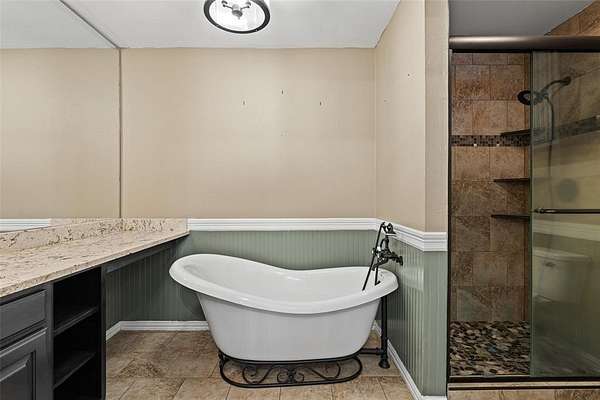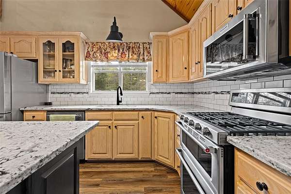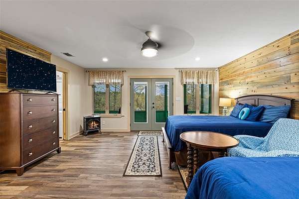 Inside, the home blends rustic character with thoughtful updates. The kitchen features granite countertops, stainless appliances, and generous cabinetry, while Satterwhite wood and blue wormwood accents add warmth throughout. A rock fireplace with gas logs anchors the living area and creates an inviting space for everyday living or hosting.
