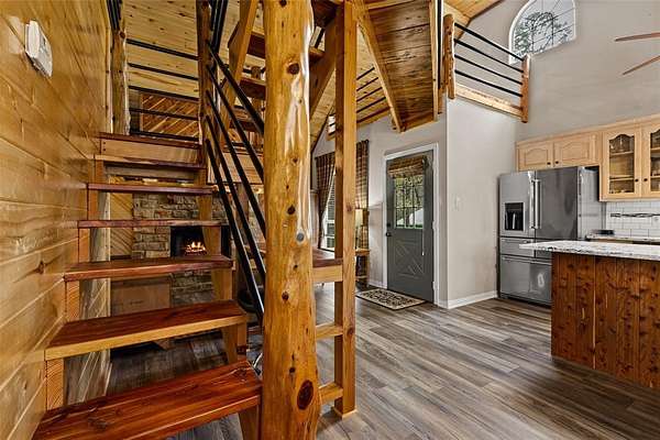 Additions completed in 2019, including the primary suite, laundry room, sunroom, and upstairs bedroom, expanded the home while preserving its cabin character.