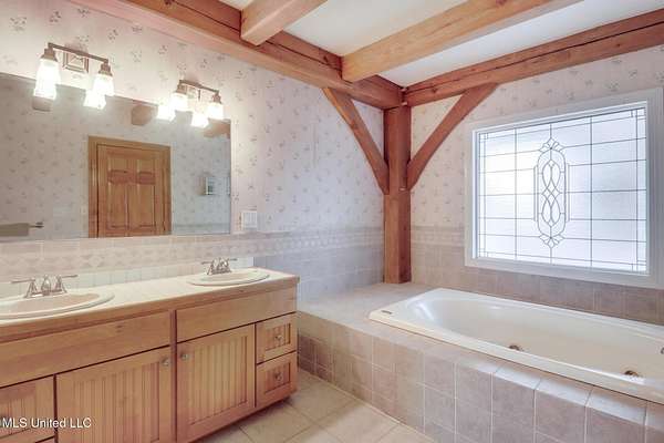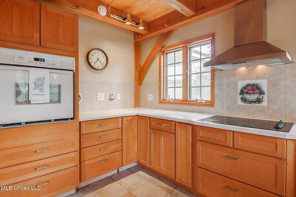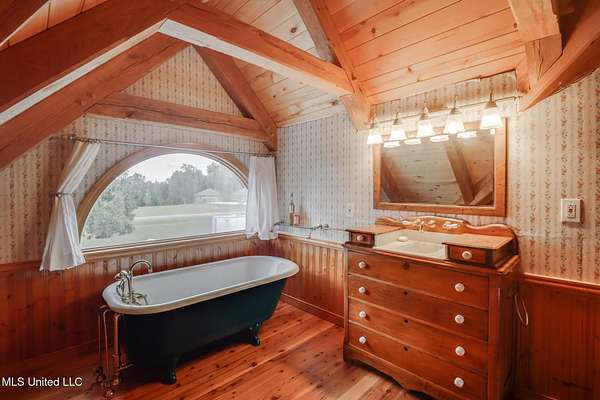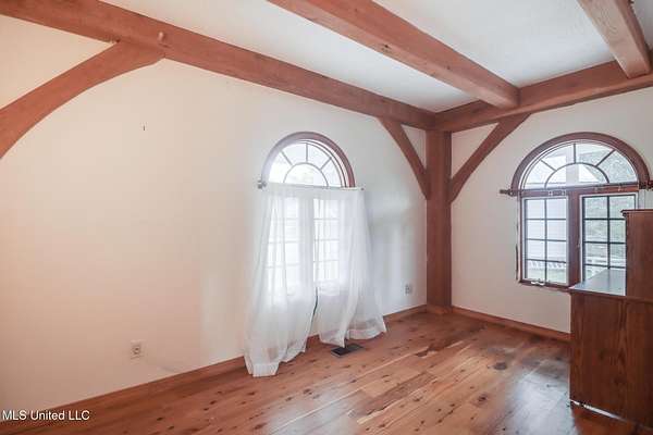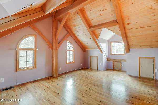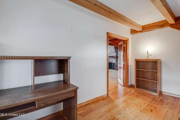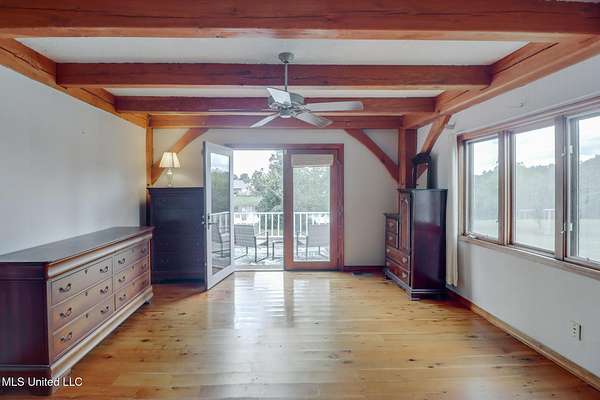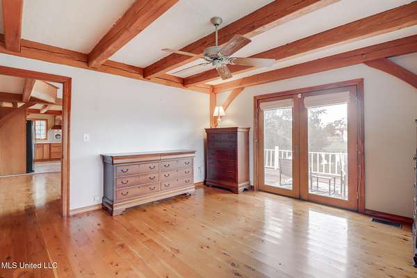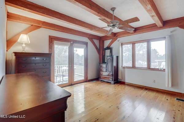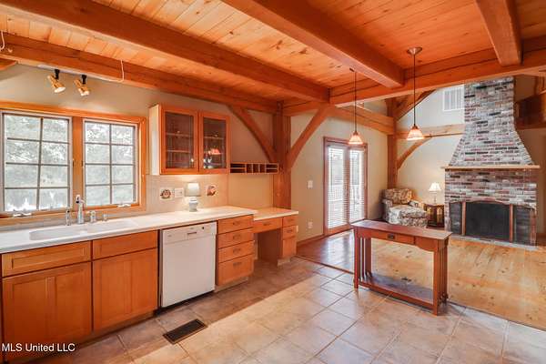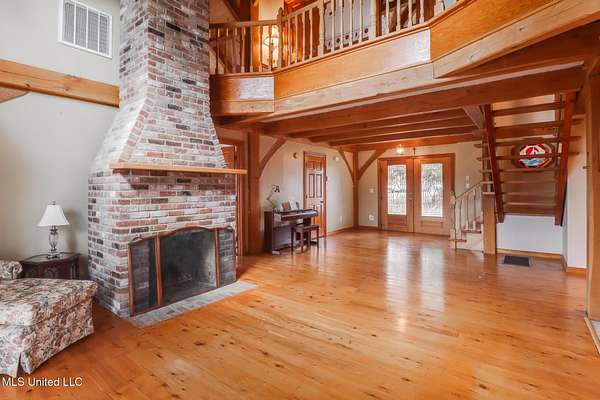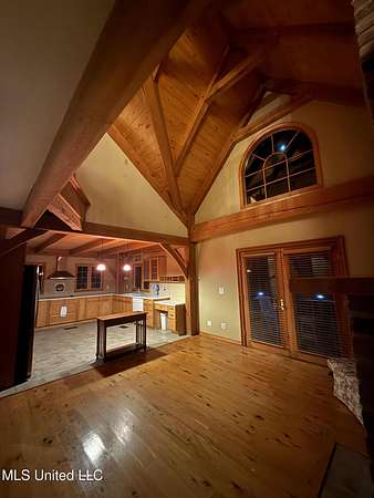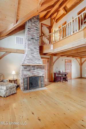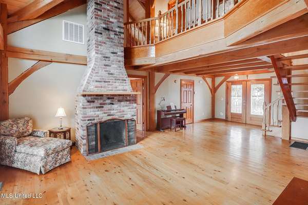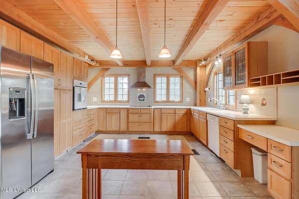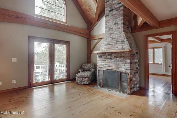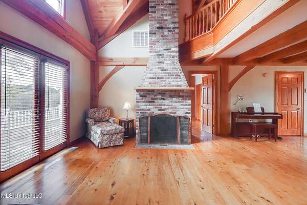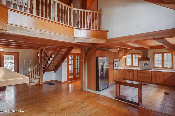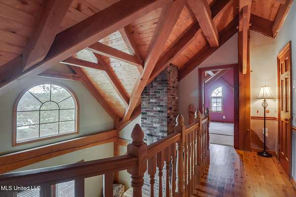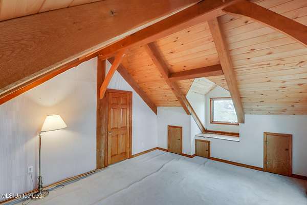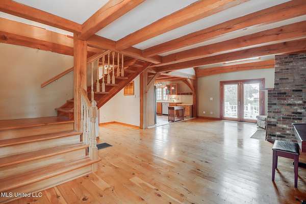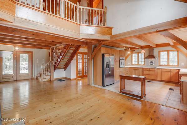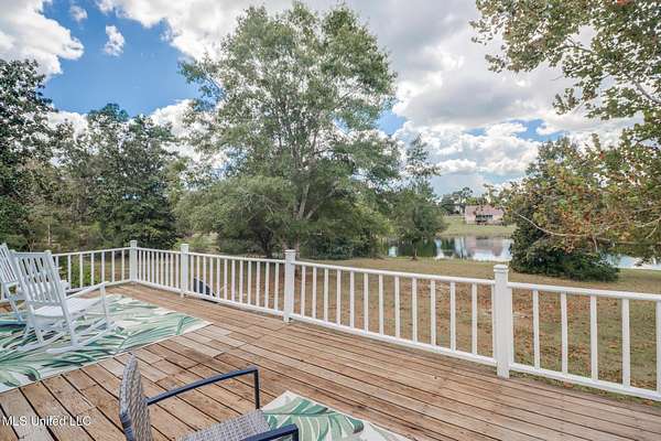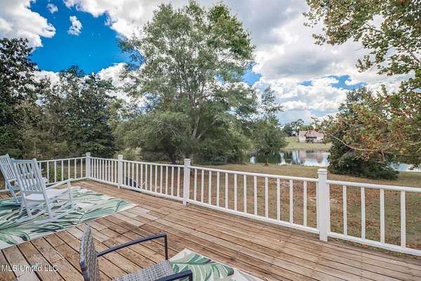 Custom Red Oak beams and finishes imported from ''up north'' welcome you into this custom built Lake House in Kiln, Mississippi. Nestled on a 1.9 Acre parcel in Ridgewood, you're close to town but far enough away to enjoy quiet country nights and beautiful skies at sunrise and dusk. Large covered front and side porches. Detached Garage. Near the end of a cul-de-sac. Upon entering you'll be wowed by the custom woodwork. Soaring ceilings in the living room opening to the cat walk. Wood burning fireplace from hearth to ceiling. On the main level enjoy nights by the fire and cooking in the large kitchen - all with sights to the lake. The Master Bedroom is just off the living room with a large bathroom and on suite access to the back deck too. To finish up living on the main level you'll find a private office with french doors and the laundry room. Up the stairs is a full bath with custom ceilings and two larger guest bedrooms. Out the back door enjoy the large deck, sights of wildlife, and cool nights. MUST SEE to appreciate. One of a kind home - a rare find in this area.