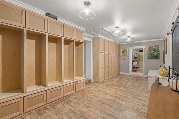 The heart of the home is the open-concept kitchen, living, and dining area. The kitchen is a chef's dream with a built-in KitchenAid refrigerator, Jenn-Air wine cooler, Frigidaire oven and warming drawer, and plenty of prep and storage space. The living room boasts a wood-burning fireplace, flanked by floor-to-ceiling cabinetry and shelving--perfect for both display and storage.