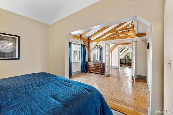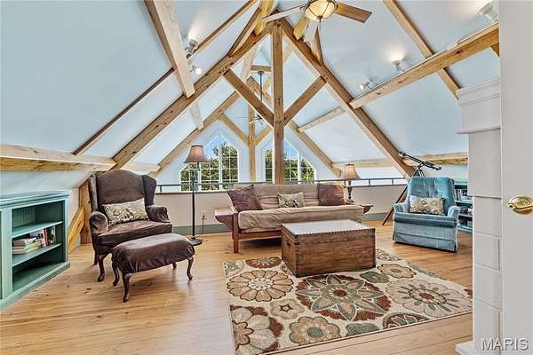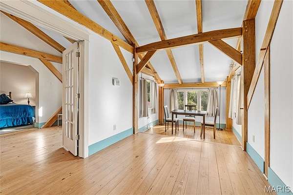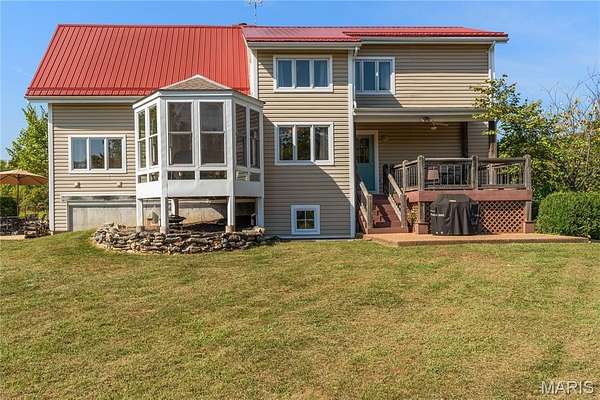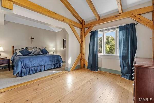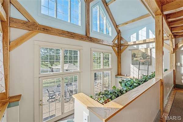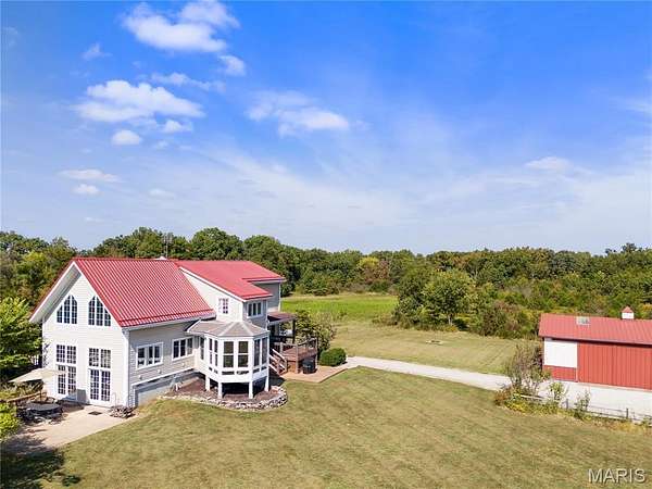Absolutely gorgeous setting for this wonderful country home on 42 acres with a 1+ acre stocked lake, wonderful guest cabin/studio & 40x30 Morton Building barn. Less than 15 minutes to Hermann wineries & shops or on your bike at the Katy Trail in 10 minutes! Extraordinary custom timber frame home with beautiful views of woods, fields & lake. Original owner/architect designed; the home offers cozy rooms sitting by the 3 fireplaces (one on each floor). Updated kitchen boasts 2 pantries, one walk-in, quartz countertops & updated appliances. The primary bedroom offers a spacious walk-in closet & renovated bath. Enjoy a beautiful loft area (which could be 4th bedroom) & children's play room/library area. The open design offers plenty of light with large windows & sunny views. A finished lower level (included in total sq/ft) offers a bedroom & full bath, family room & plenty of storage. New HVAC 2022. Enjoy a cozy cabin by the lake, 2 docks, fishing and hiking! Duplicate listing of 25023431 Suitable for Bed/Brk