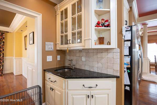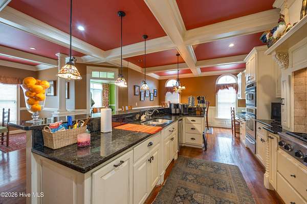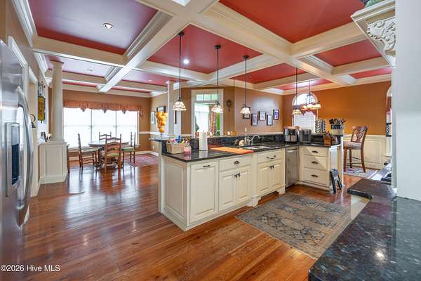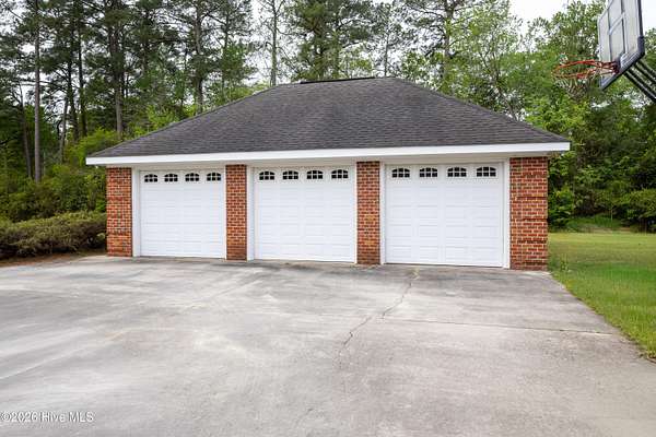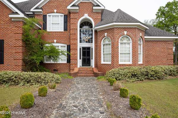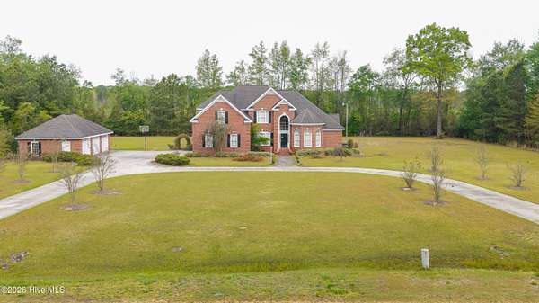 Stately custom brick home on 2+ acres. This impressive residence features 5 bedrooms and 4.5 baths with exceptional craftsmanship throughout, including extensive, intricate wainscoting and detailed moldings that elevate every space. Grand two-story foyer opens to a spacious family room with 22-foot ceilings, fireplace with gas logs and opens to screened porch. Main level includes a primary suite with sitting area, jetted tub, tiled shower, and walk-in closet with wood shelving. A second bedroom with private bath is also on the first floor, ideal for guests or multi-generational living. Enjoy both a formal dining room and a cozy breakfast nook, along with a well-appointed kitchen featuring coffered ceilings, granite countertops, custom cabinetry, gas cooktop, built-in oven, warming drawer, built-in desk, pantry and wet bar. Just off the kitchen, a sunroom/den opens onto a porch and stone patio, perfect for indoor-outdoor living and entertaining. Laundry room includes sink and ample storage. Upstairs offers 3 additional bedrooms, Jack-and-Jill bath, an additional full bath. Exterior features include a wrought iron fenced backyard, screened porch, stone patio, decorative rock water feature, circular driveway, attached 2-car garage, and detached 3-car garage that is wired and pre-plumbed. Located on over 2 acres just within town limits, this home combines privacy with convenience. Custom homes with this level of detail, square footage, and garage space are hard to find and can't be replicated at this price!