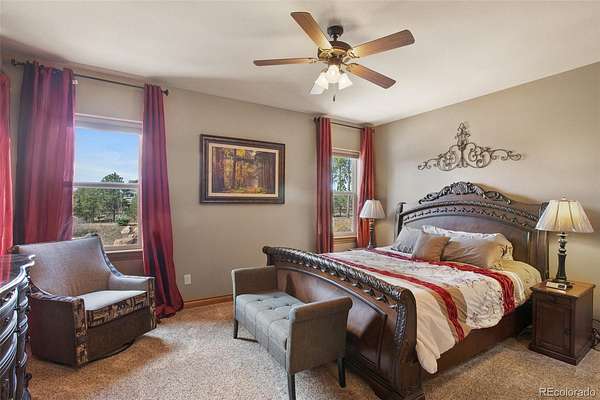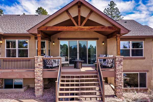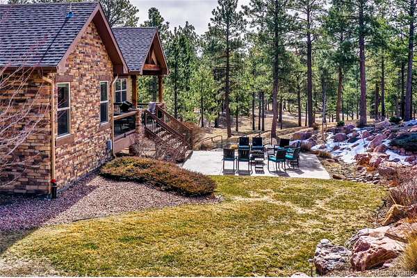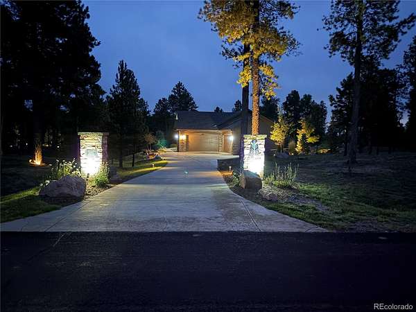 Nestled on 2.56 acres within the highly desirable Black Forest, Cathedral Pines community, this exquisite Vacation custom home is surrounded by towering Ponderosa pines. Offering an ideal fusion of luxury and adventure, providing endless opportunities for outdoor recreation, the property's attributes include a treehouse, slide, and zip line. Upon entering the home, you will be greeted by the great room with natural wood floors and a convenient, cozy fireplace. The main floor includes an open-concept kitchen, meticulously designed to harmonize aesthetics and functionality. Featuring granite countertops, an induction cooktop, and double ovens. You will discover a master suite with its spacious walk-in closet and a five-piece master bath featuring a relaxing, massaging, jetted bathtub. Two other main-level bedrooms and the two basement bedrooms all have walk-in closets. Large sliding doors offer breathtaking mountain views, creating a warm and inviting ambiance. New Carpets in all bedrooms and new flooring in the basement. Other notable features include a sound system compatible with online music services and three strategically positioned Wi-Fi hotspots on the main level. The fully finished basement offers multiple amenities. The spacious family room boasts a kitchenette, pool table, and for an immersive movie experience, there is a full theater room with reclining seats. In the spacious four-car garage, you will be greeted by newly painted epoxy floors. The exterior of the property is equally impressive, boasting a heated driveway, a stamped concrete patio, and a fenced-in dog run. Retreat to the back deck and enjoy peaceful evenings, accompanied by the soothing sounds of your own water feature, while a built-in gas line provides the opportunity for outdoor entertainment. Enjoy access to scenic hiking trails, tranquil water features, a stocked fishing pond, and an exclusive lodge. Do not miss the opportunity.