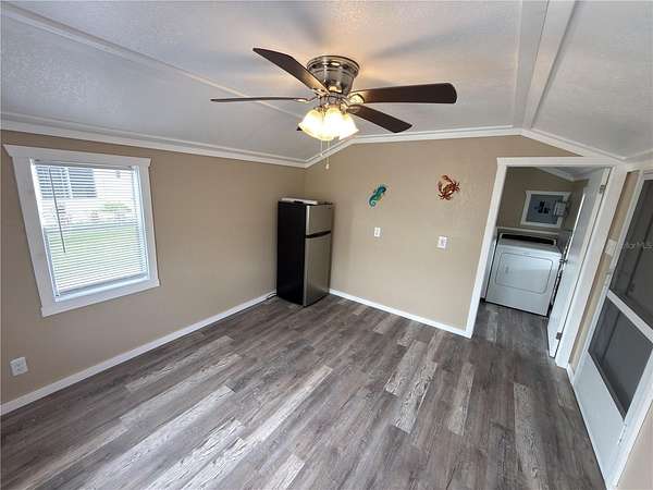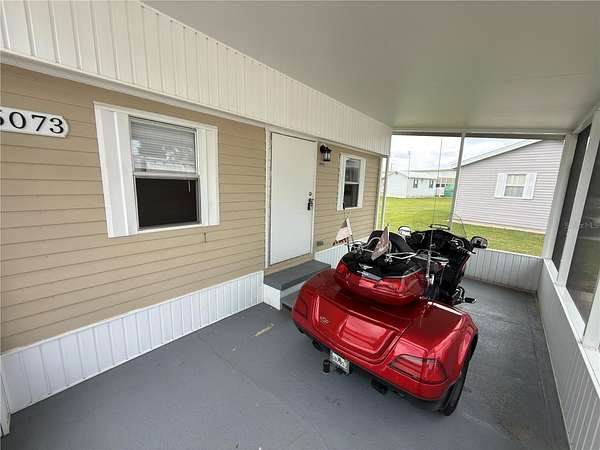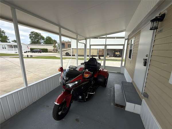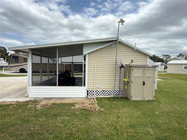 The climate-controlled casita shed goes well beyond storage. Thoughtfully outfitted for day-to-day living, it includes a comfortable sitting area, mini refrigerator, television, ceiling fan, and a dedicated computer workspace. The full bathroom is equally well-appointed, with a washer and dryer, shower, toilet, sink, water heater, and exhaust fan. Step outside and the attached screened-in covered porch extends your living space even further — a natural spot for morning coffee, evening conversations, or simply enjoying the Florida air without the bugs. Whether you need a guest suite, a quiet home office, a hobby space, or simply a place to decompress — this casita delivers.