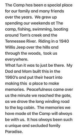 From Linden, turn right onto Linden Pineview Rd. 9.4 miles, turn left onto Toms Creek Rd.1.7 miles, turn left onto Bible Hill Rd. 0.8 miles, turn right onto Deer Creek Spur. 1.2 miles, turn right onto Deer Creek Rd. 0.5 miles, turn right onto Lakeside Dr