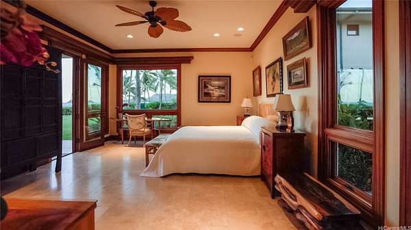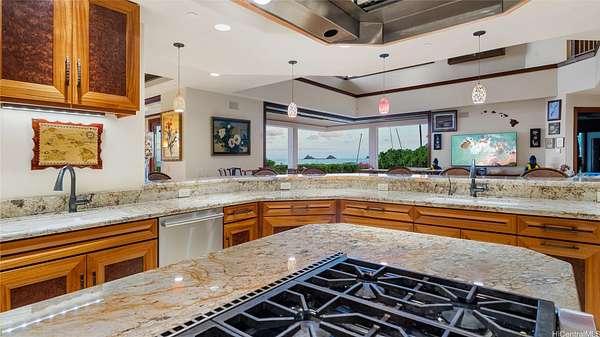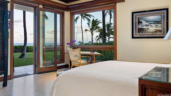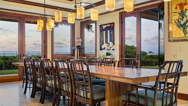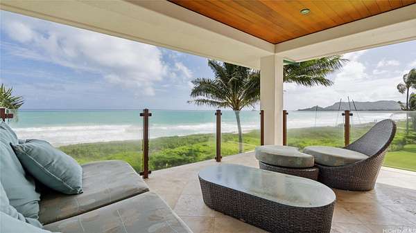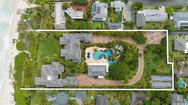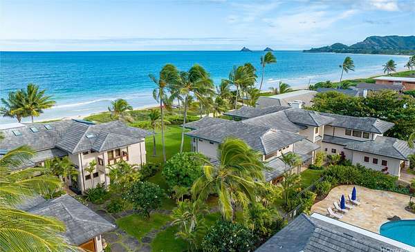 Unparalleled, the Mele Komo Beachfront Estate located on the pristine shores of Kailua Beach, offers the most discerning connoisseur the ultimate in coastal living. With an impressive 12 beds and 13 baths, this 12,005 square-foot architectural marvel was meticulously designed prioritizing enjoyment with 9 ocean facing bedrooms and 11 private lanais. At 2.2-acres it's the largest residential lot on the Kailua Beachfront. The Primary Hale, boasting 6 beds and 6.5 baths within 5,835 sqft, and the Guest Hale, a companion masterpiece with 6 beds and 6.5 baths spanning 6,170 sqft, offer unparalleled living spaces designed with the perfect combination of luxury comforts and Hawaiian detail. Indulge in resort-style living with a 96,000 gallon pool showcasing a waterfall, slide, jacuzzi, and a private grotto. The 2,000 sqft Pool Cabana with a full kitchen, full bath, spacious loft, and laundry facilities adds an extra touch of convenience and comfort. Mele Komo provides the utmost in privacy and efficiency, featuring 94 photovoltaic panels, privately owned beach access, and stunning views of the famed Mokulua Islands. A unique opportunity to own a true jewel of the Hawaiian coastline.