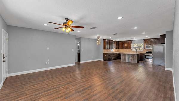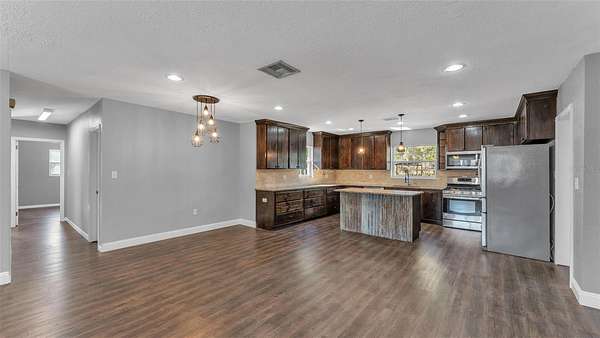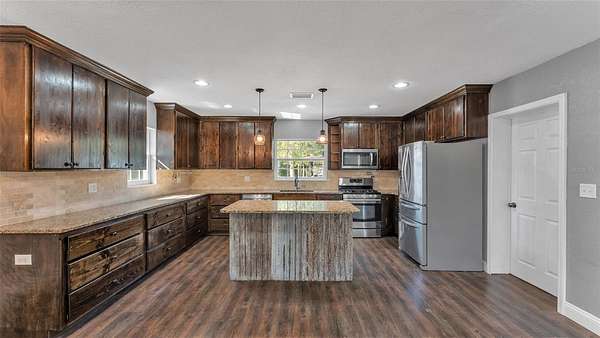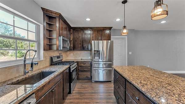 Rare opportunity to own a beautifully upgraded 4-bedroom, 3-bath home on 5 fully dry acres, currently zoned agricultural and offering complete freedom with NO HOA. This home features a desirable split floor plan and a spacious open-concept layout, perfect for both entertaining and everyday living. The kitchen is a standout with handcrafted cabinetry, a large center island, and granite countertops, plus a private oversized laundry/utility room tucked away for added convenience. Outdoors, the property truly shines with a 2,000 sq ft steel workshop featuring four garage doors and full electric, ideal for hobbies, equipment, or a home-based business. The land is already set up for chickens and bunnies, with endless room for animals, gardens, or future expansion--bring your vision to life. Solar panels add energy efficiency and long-term savings. A unique property offering space, privacy, and limitless possibilities.