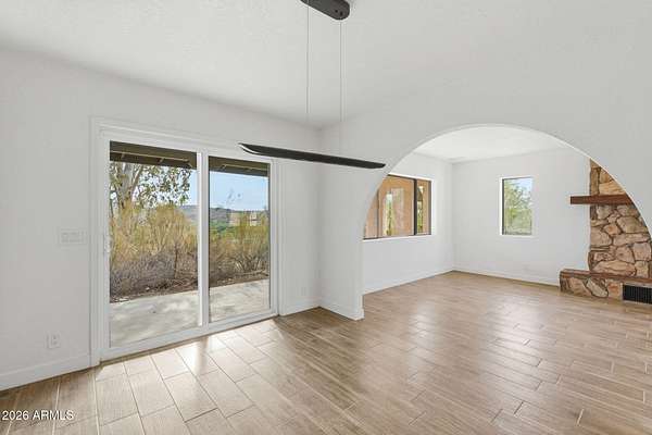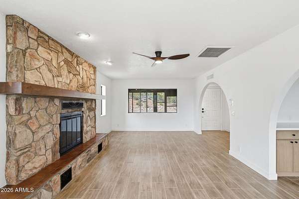 Experience the charm of open desert living in this move in ready, 3 bed, 2 bath home on 5 sprawling acres. An enclosed front patio welcomes you in, while fresh interior & exterior paint and new wood-look tile flooring create a clean, modern feel throughout. The living room features a cozy wood burning fireplace & the updated kitchen shines w/ new cabinets, quartz countertops, tiled backsplash, & stainless steel appliances. The primary suite offers an upgraded bathroom w/ a new vanity, walk in shower & walk-in closet. Step outside to a covered patio and wide open desert space ready for your vision. Complete w/ a 3 car garage.