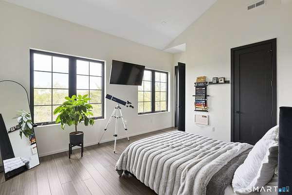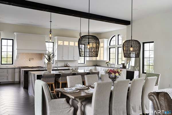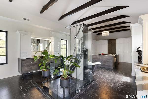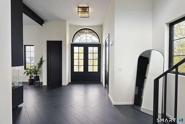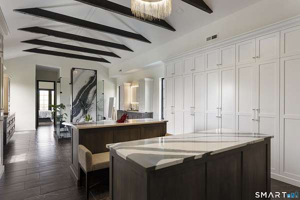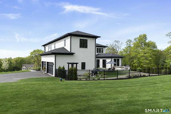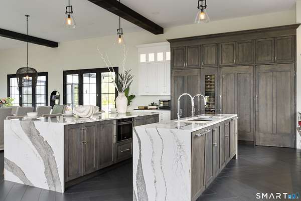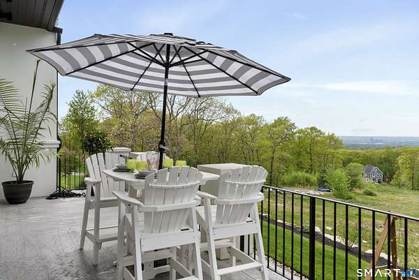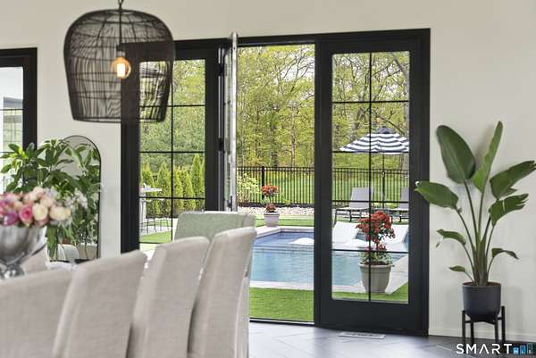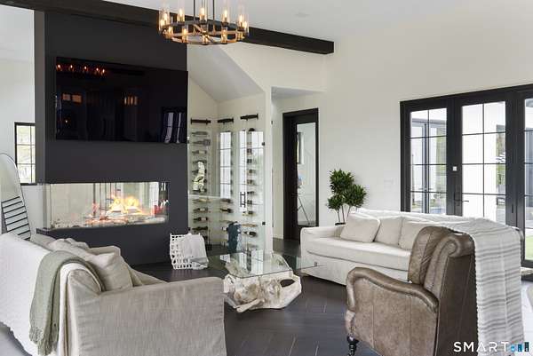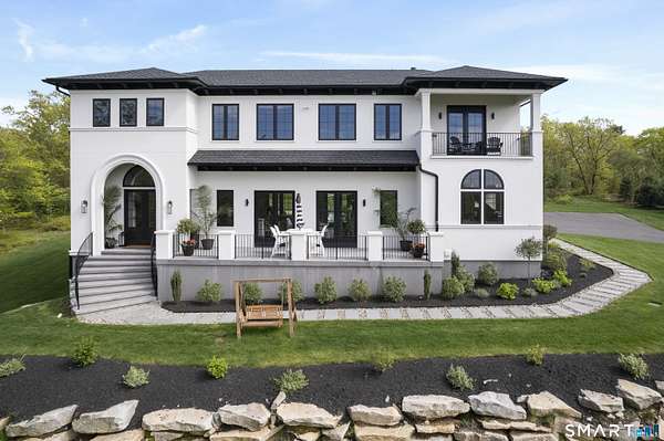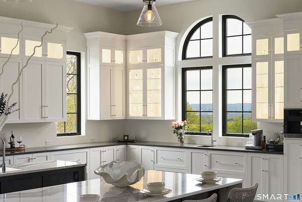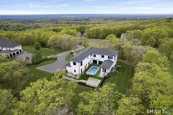 Perched atop a scenic ridge in Glastonbury, this Mediterranean-inspired estate offers breathtaking panoramic views, including the Connecticut State Capitol, with seamless indoor-outdoor living. Designed to capture natural light from every angle, the home features custom Andersen Windows, elegant French doors, and refined finishes throughout. The open-concept main level is anchored by a chef's kitchen with dual Cambria islands, custom cabinetry, and a private butler's pantry with discreet access to the garage. A striking three-way fireplace, glass-enclosed wine room, and designer lighting enhance the home's sophisticated flow. Outdoor living is elevated with a heated in-ground pool, attached pool house, outdoor kitchen, and private putting area, all positioned to enjoy stunning seasonal views. Upstairs, all bedrooms offer en suite baths and walk-in closets. The primary suite features a private balcony, fireplace, wet/coffee bar, and a spa-like bath with seamless glass shower and dual amenities. The custom walk-in closet includes a hidden door leading to a private office or gym. A rare offering combining privacy, design, and convenience-just minutes to highways, shopping, dining, and within easy reach of Boston and New York City.