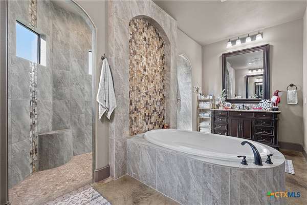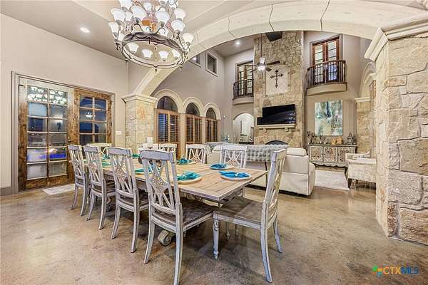 - Beamed Ceilings, Built In Features, Carbon Monoxide Detector, Ceiling Fans, Chandelier, Crown Molding, Double Vanity, Eat In Kitchen, Game Room, Garden Tub Roman Tub, High Ceilings, His And Hers Closets, Home Office, Jetted Tub, Main Level Primary, Multiple Closets, Multiple Living Areas, Open Floorplan, Primary Downstairs, Tray Ceilings, Wet Bar
