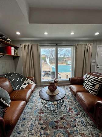 Nestled along prestigious Rockford Road in one of southern Oklahoma's most sought-after and refined neighborhoods, this exceptional four-bedroom, 2.5 bath estate offers 2,481 square feet of beautifully curated living space on approximately 2.27+- acres. Additionally, the pool house has been transformed into a luxurious, modern two-bedroom guest retreat, featuring two generously sized bedrooms thoughtfully separated by a shared full bath, offering both comfort and privacy. The home has been thoughtfully remodeled back in 2018 and further enhanced with contemporary upgrades over the past two year, the home is truly turn-key, seriously maybe one of the cleanest home's and property's I've ever been in. It's seamlessly blending timeless elegance with modern comfort. Located within the highly acclaimed Plainview School District, and less than two miles from the campus, this residence delivers both luxury and convenience. Inside, a light-filled open floor plan creates an inviting atmosphere ideal for both intimate living and sophisticated entertaining. The expansive living room is anchored by a gas log fireplace and flows effortlessly into the dining area connected to a stunning gourmet kitchen. The kitchen is a true showpiece, featuring quartz countertops, a gas range, premium stainless-steel appliances, and a centrally positioned island perfect for casual dining, gathering, and conversation. From the dining area, striking double sliding barn doors open to a private office-an elegant and functional space ideal for remote work or study. The thoughtfully designed split-bedroom layout ensures privacy and versatility. One additional room has been transformed into a game room, fitness studio, or lounge, offering flexibility to suit your lifestyle. Outdoor living is nothing short of spectacular. Step onto the expansive back patio covered with Trex composite deck-crafted for durability, comfort, backed by a 100-year warranty-perfect for relaxing, entertaining, or enjoying outdoor gatherings. The backyard unfolds as a breathtaking private sanctuary, richly layered with vibrant flowering gardens and beautiful lush plants, all beneath the canopy of mature shade trees. Impeccably manicured landscaping surrounds an in-ground swimming pool, creating a serene, resort-like atmosphere. Completing this outdoor paradise is a beautifully appointed two-bedroom, one-bath pool house, offering a luxurious and tranquil retreat for guests or extended stays, seamlessly immersed in nature. Both the front and rear lawns are impeccably maintained and supported by a customized sprinkler system with timer, ensuring effortless irrigation year-round. Additional features include a side-entry attached garage for convenient all-weather access and a wide concrete driveway offering generous parking for guests. With its refined updates, exceptional outdoor amenities, and prime location, this remarkable property presents a rare opportunity to enjoy upscale living at its finest. This elegant home must be experienced in person to fully appreciate the lifestyle and value it offers. Showings by appointment only. Please contact the listing agent to schedule your private viewing.