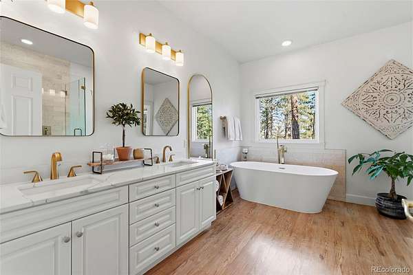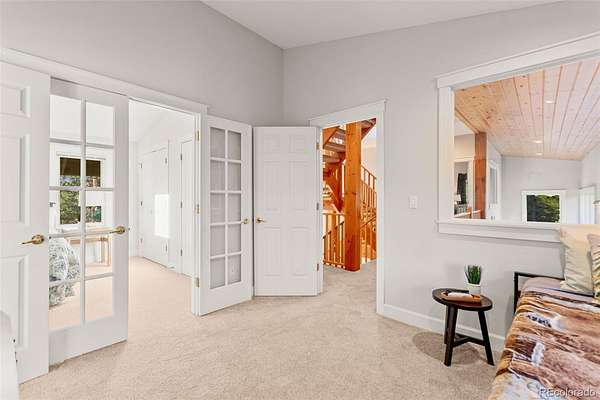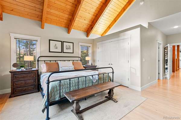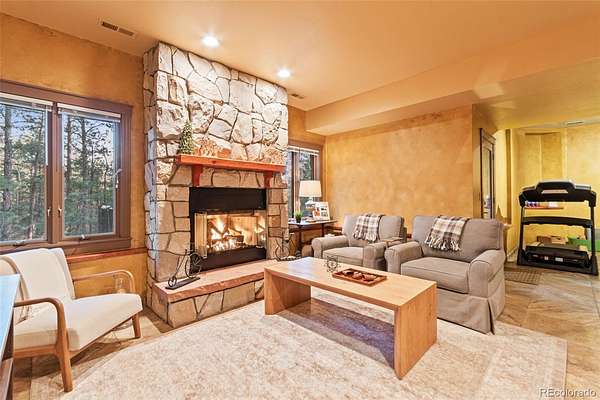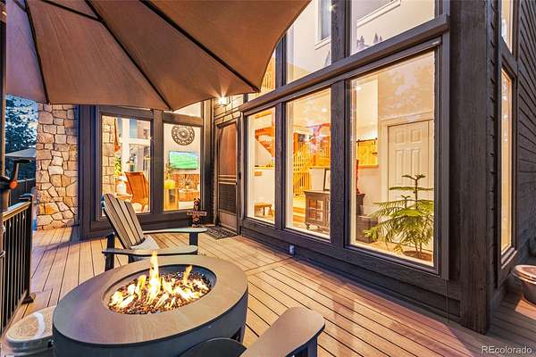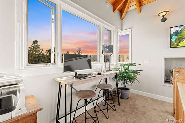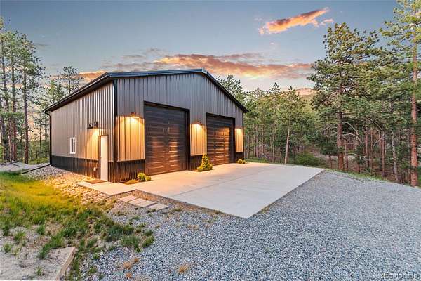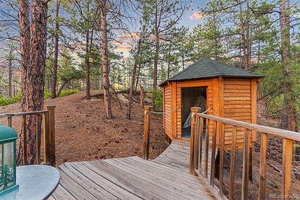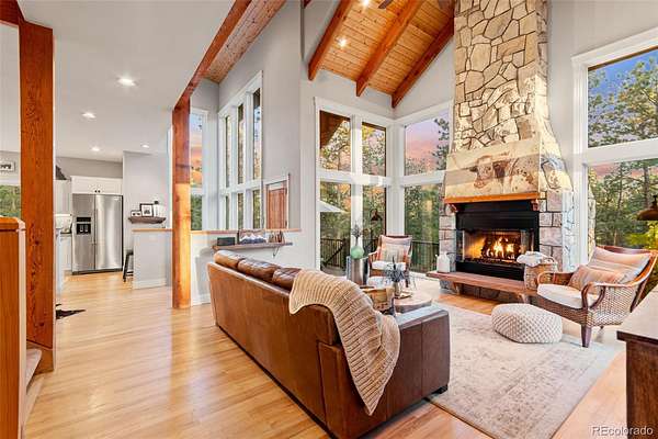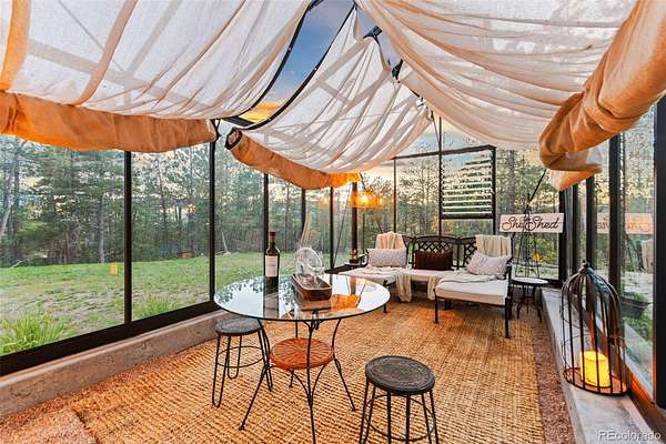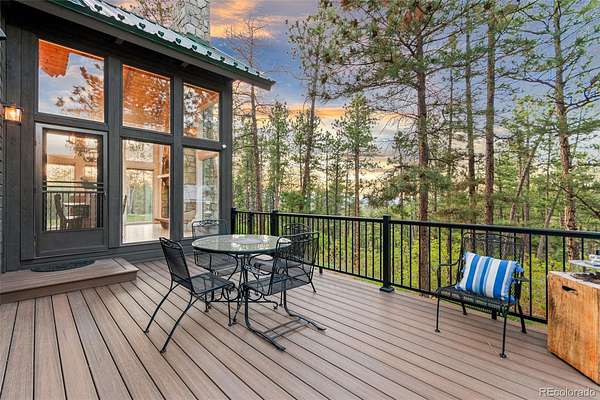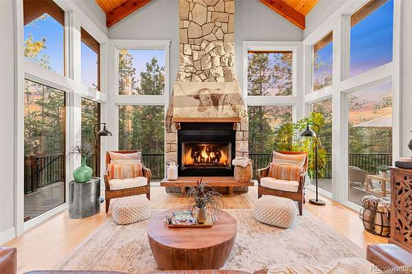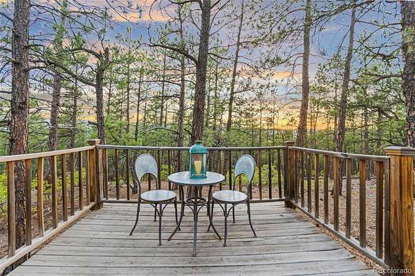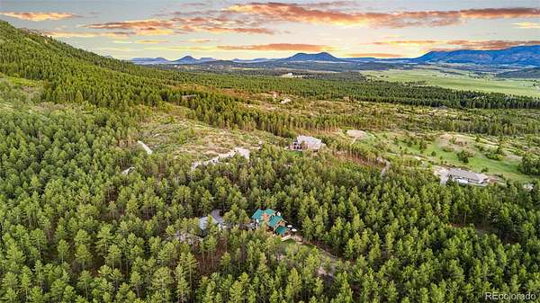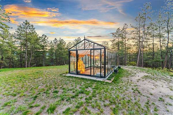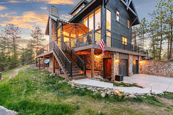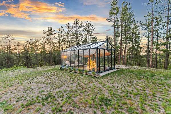 Tucked into the rolling hills of Dawson Butte, this private mountain retreat spans 36 heavily wooded acres and captures sweeping valley and Front Range views in every direction. Designed to blend comfort with Colorado’s natural beauty, the 3,709 square foot custom walkout home offers a refined yet welcoming layout anchored by a main-level primary suite and expansive gathering spaces that frame the landscape beyond. Inside, soaring 19-foot vaulted ceilings and dramatic two-story picture windows flood the great room with light, while a stone fireplace creates warmth and architectural presence. The kitchen is thoughtfully appointed with granite countertops, stainless appliances, a wine cooler, and seamless flow into both formal and informal dining areas. A finished walkout lower level adds versatile living space for recreation, guests, or multi-generational living. Outdoors, a wraparound deck invites sunset evenings beneath towering pines, while an observatory room captures panoramic 360-degree views. A 36x36 detached RV garage with 12-foot doors, greenhouse, and additional outbuildings provides rare functionality, delivering privacy, acreage, and lifestyle flexibility in one exceptional Dawson Butte estate.