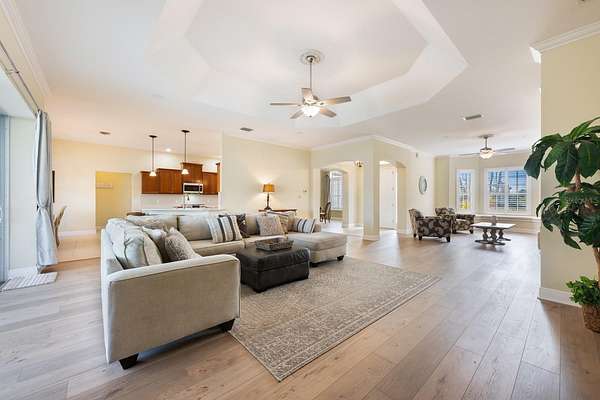 - Built-In Features, Ceiling Fans(s), Crown Molding, Eat-In Kitchen, High Ceilings, Kitchen/Family Room Combo, Open Floorplan, Primary Bedroom Main Floor, Solid Surface Counters, Split Bedroom, Stone Counters, Thermostat, Tray Ceiling(s), Vaulted Ceiling(s), Walk-In Closet(s), Window Treatments