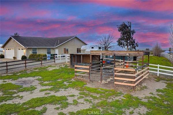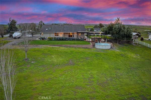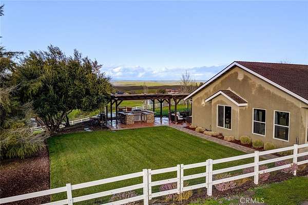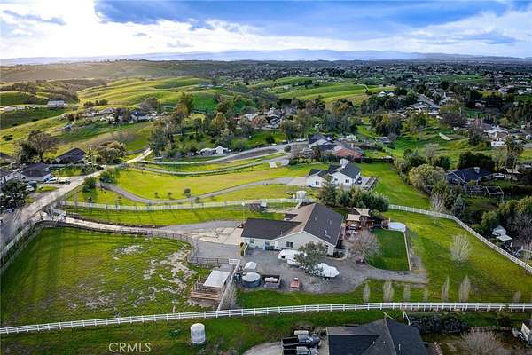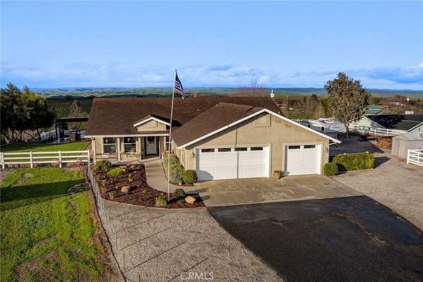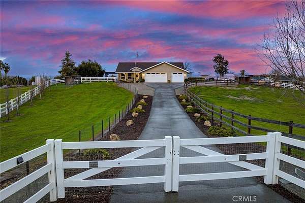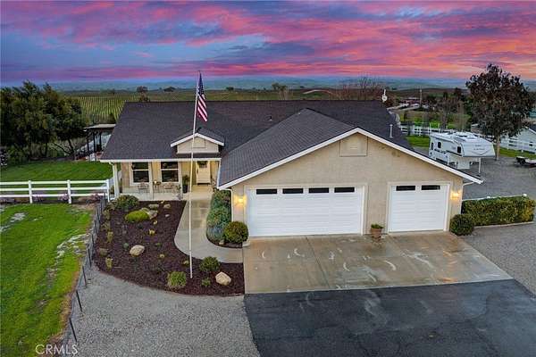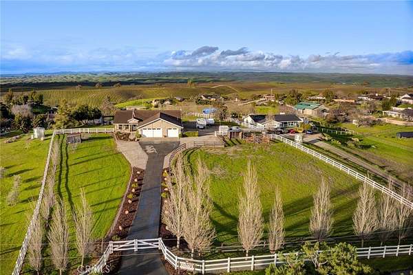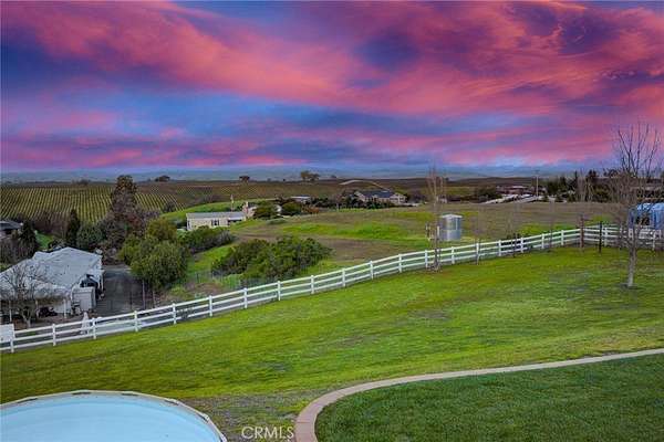 Built in 2005, this beautifully maintained 4BD/2BA home sits on 2 usable, manicured acres in the rolling hills of Paso Robles, overlooking vineyards and countryside with stunning sunset views. An electric gate opens to a long-paved driveway and fully fenced grounds featuring white vinyl three-rail fencing with additional snake fencing.