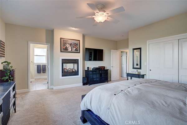The sun-filled interior showcases high 9-foot ceilings and expansive windows that invite abundant natural light throughout. The kitchen features granite countertops, stainless steel appliances, and generous storage, along with indoor laundry and an oversized 3-car garage. The living room fireplace creates a warm focal point, while the primary suite offers a double-sided fireplace shared with the en-suite bath, complete with a sunken soaking tub and spacious shower.
