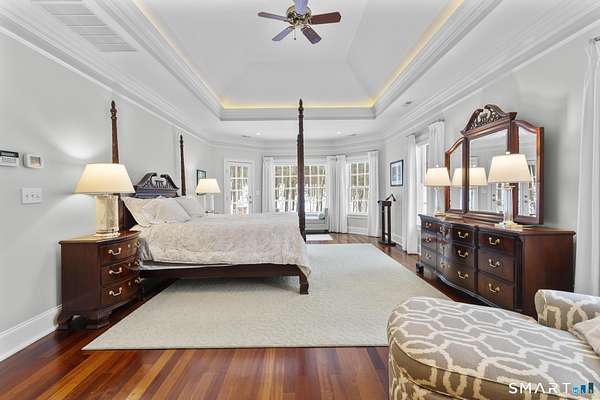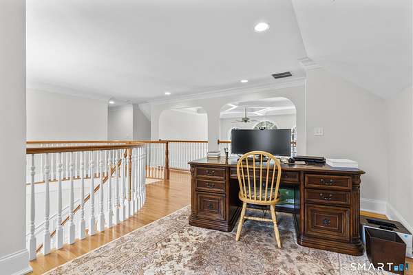 Nestled on a quiet stretch of Elderslie Lane in picturesque Woodbridge, Connecticut, this exceptional residence was custom built by renowned craftsman Peter Olsen as his own home, showcasing uncompromising quality and timeless design. A grand marble entry welcomes you with a dramatic circular staircase, setting the tone for the elegance found throughout. Rich cherry hardwood floors flow seamlessly into beautifully appointed living spaces, highlighted by two stunning coffered ceilings and thoughtfully placed balconies that add architectural interest and warmth. The gourmet kitchen is a chef's dream, featuring Sub-Zero refrigeration, Wolf appliances, granite countertops, and custom cherry cabinetry-perfect for both everyday living and entertaining. The living room is anchored by a breathtaking floor-to-ceiling stone fireplace, creating a refined yet inviting atmosphere. The first-floor primary suite offers privacy and comfort, complete with a luxurious bathroom retreat. Throughout the home, the design and attention to detail are second to none. Overlooking serene, wooded surroundings, this home offers a rare sense of peace, privacy, and craftsmanship-an extraordinary property in an equally extraordinary setting. Located in an award-winning school district with convenient access to Yale University, downtown New Haven, major highways and shopping!