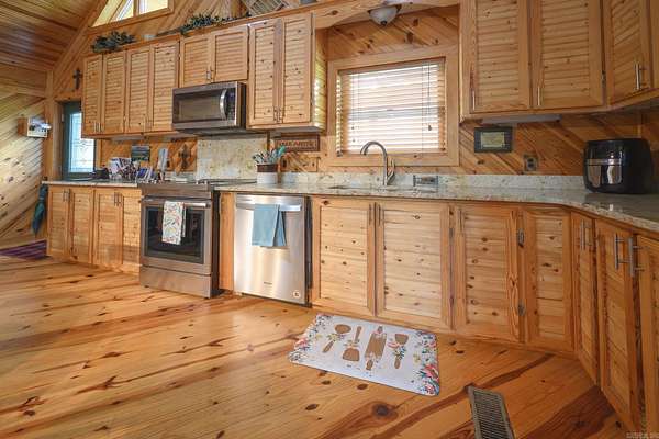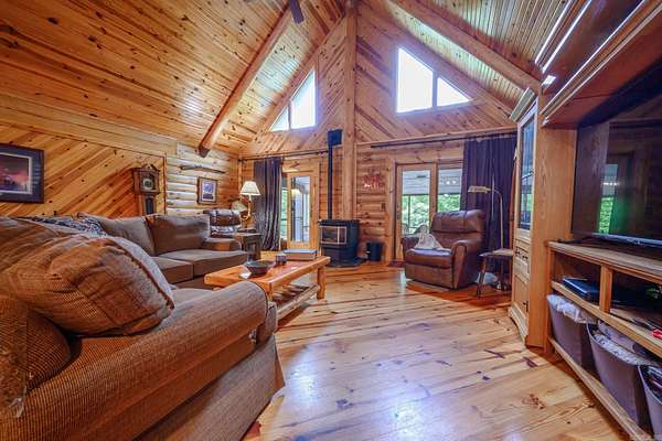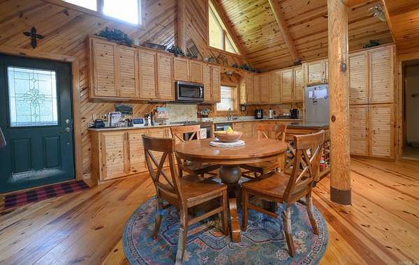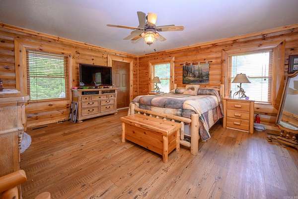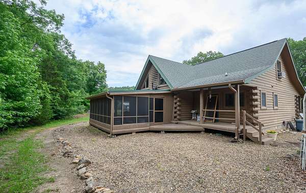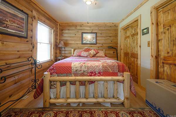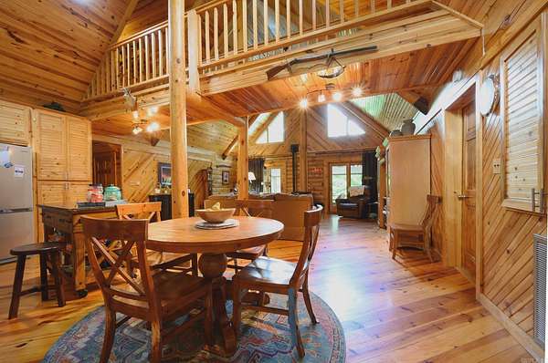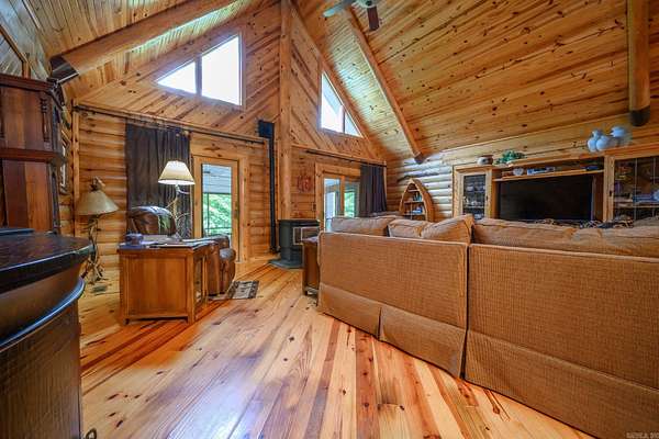 Searching for a turn-key country oasis? Take a look at this spacious, custom built, traditional LOG CABIN! Situated in the beautiful Oden area, this property includes 31 acres of both pasture and forest land. You'll first notice an expansive, welcoming front porch just waiting to be enjoyed! Step inside and see the beautiful knotty pine interior and lodge like open concept layout! Living area Features include gorgeous wood floors, high ceilings, and a WOOD PELLET STOVE. The kitchen is outfitted with new stainless steel appliances, a JennAir range electric stove w/ down draft, lovely wood cabinetry with expertly crafted pull out shelves, and granite countertops! The large Primary suite has new vinyl flooring, a walk in closet and an in-suite bathroom including a jacuzzi tub! The home features a lofted second story with 2 additional bedrooms! There is a screened in back patio to enjoy beautiful summer evenings. This property BORDERS NATIONAL FOREST on 2 sides! A CREEK runs from the National Forest through the property, adding even more value to this special property. There is also a 30x40 ft shop on the property. If you're looking to escape it all in style, this is the spot!