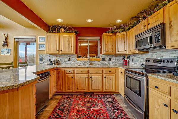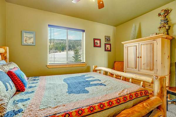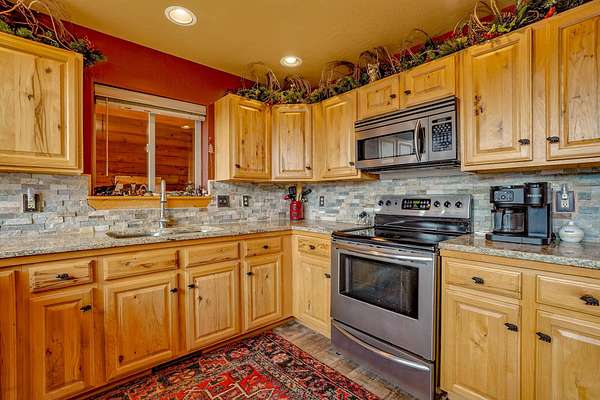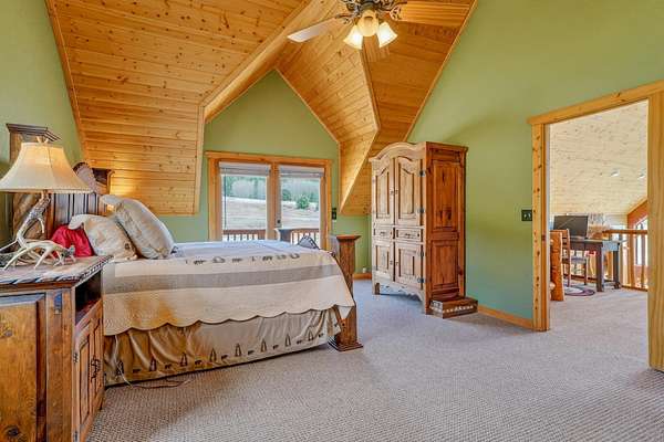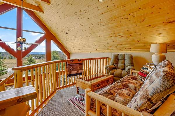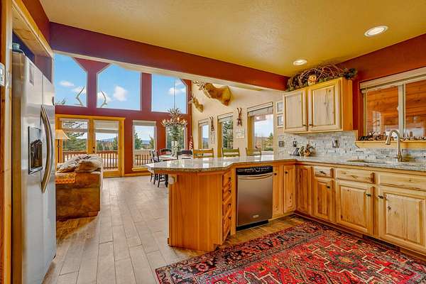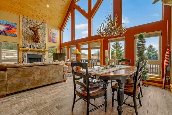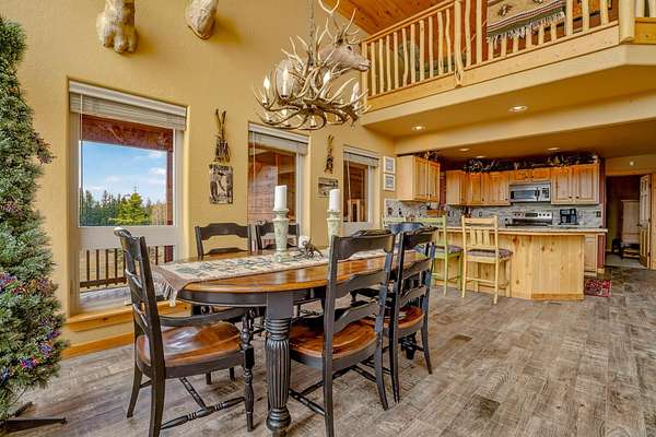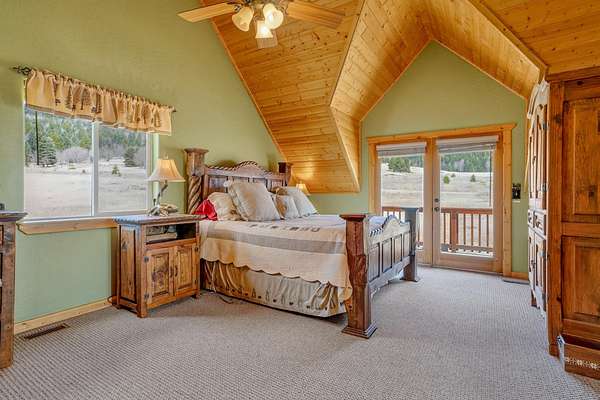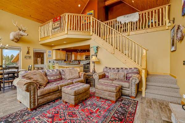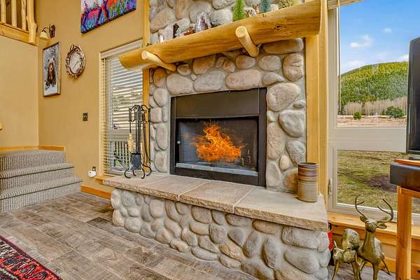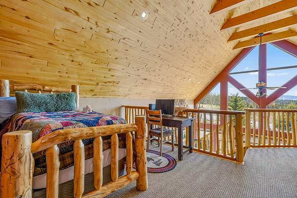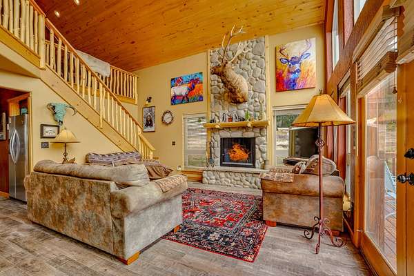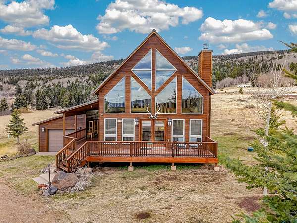 Pour a cuppa, get cozy in a deck chair and breathe in the mountain air and wide-open views as the elk saunter by. This well-maintained chalet sits on more than 2 acres that are flat enough to encourage outdoor play, fort building and snow-shoeing. Plus, there's a greenbelt along the back of the lot! The outdoors comes inside with a beautiful wall of windows as you cozy up by the wood burning fireplace. The open kitchen with stainless appliances provides a great space for creating fun nights with friends and family. There are two bedrooms, a full bath and laundry on the main floor. The second level offers an office/bunk loft outside of the primary bedroom and bath. The upper bedroom has it's own staircase to nature so you can sneak out and enjoy the stars.