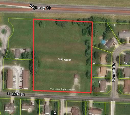 This 3.92-acre residential parcel offers space, privacy, and flexibility inside Flora's city limits. The property features approximately 375 feet of frontage along E 12th Street, providing straightforward access to the tract. The north boundary runs along Highway 50 (no direct access from the highway). A 24x24 utility garage constructed in 1994 sits on the property and offers immediate storage or workspace options while you plan your build. The ground is mostly open and easy to work with, and several mature conifers line portions of the perimeter, creating a natural border with shade and windbreak benefits. Whether you're considering a single homesite with a large yard, room for additional outbuildings, or exploring the potential to divide the acreage into multiple parcels, this property gives you multiple pathways for future use. Opportunities for this much in-town acreage are uncommon.This one deserves a look.