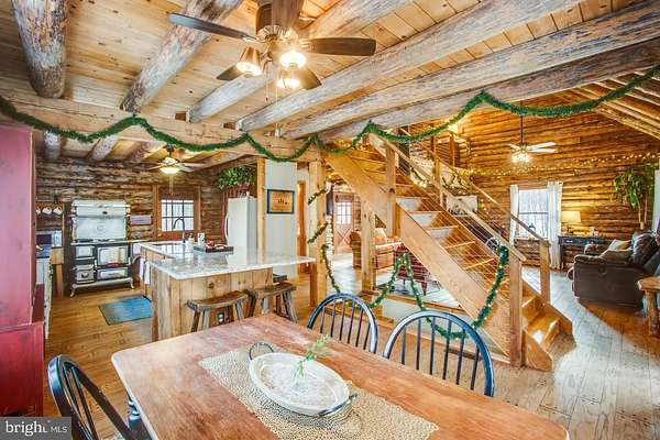 - Ceiling Fan(s), Exposed Beams, Island Kitchen, Open Floor Plan, Wood Floors, Wood Stove